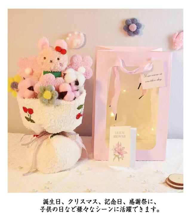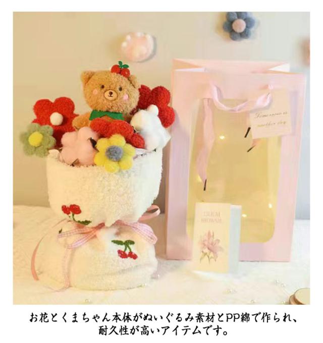 | 普通の花束とは異なり、ぬいぐるみで作られた遊び心満載で特別な一品です。 お子様はもちろん、ご家族、お友達、恋人など大切な方やお世話になった方への贈り物としてもおすすめです。誕生日、クリスマス、記念日、感謝祭に、子供の日など様々なシーンに活躍できます。 お花とくまちゃん本体がぬいぐるみ素材とPP綿で作られ、耐久性が高いアイテムです。 メッセージカードが付属され、感謝の気持ちを込めて送る相手へ祝福の言葉を伝えられます。 本製品は一つ一つ手作業で作り上げ、手作りならではの風合いを楽しめます。 | |
