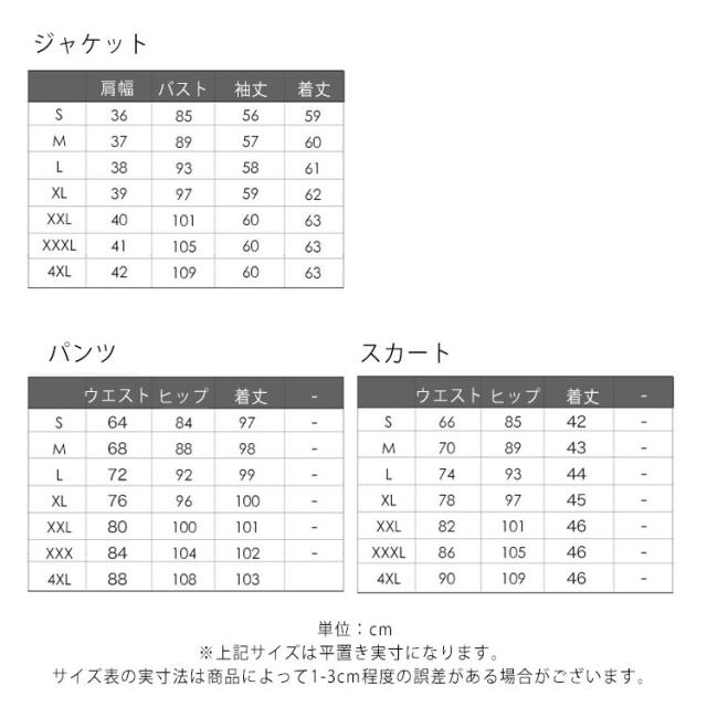| 色 | 黒(パンツスーツ) 黒(スカートスーツ) 紺(パンツスーツ) 紺(スカートスーツ) |