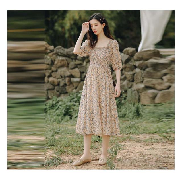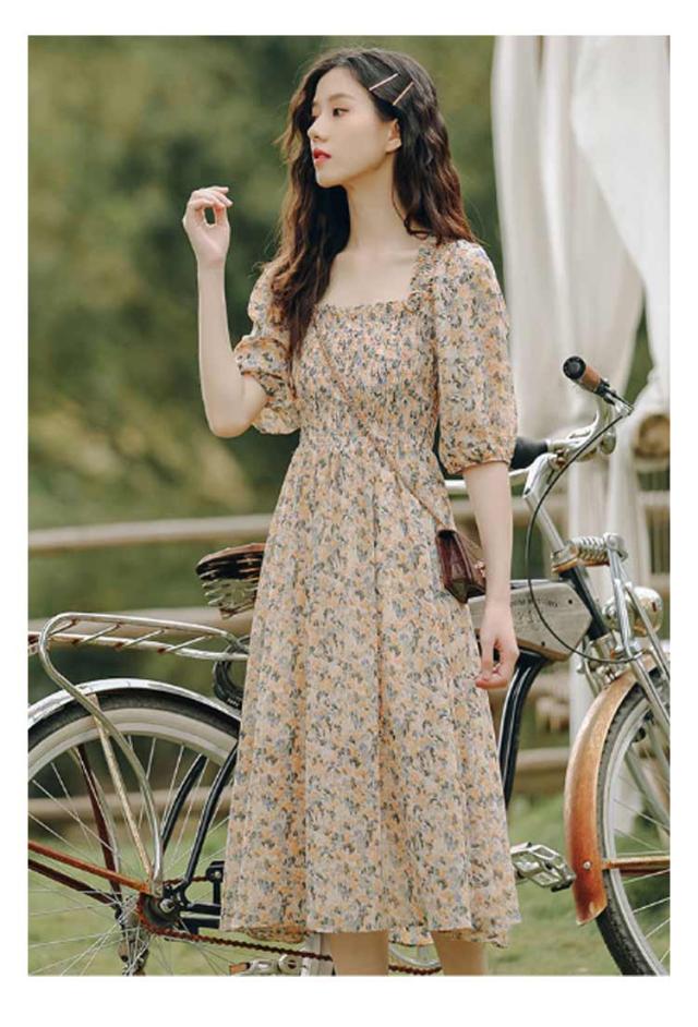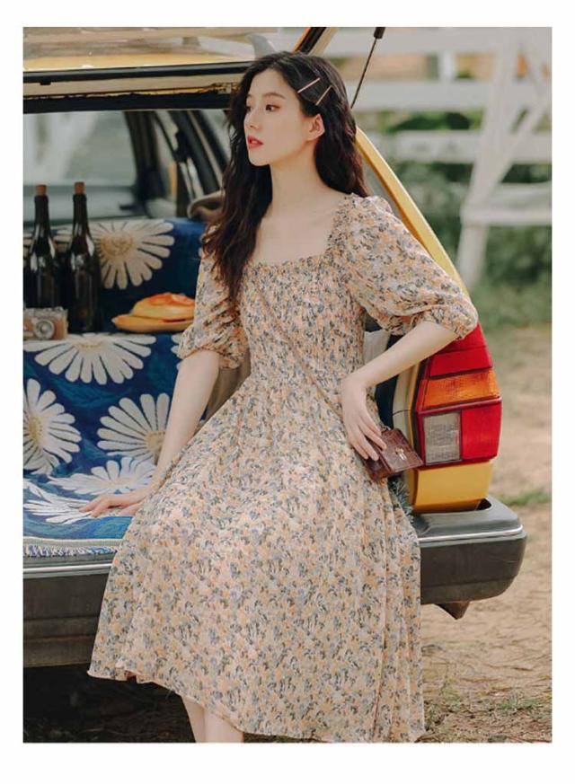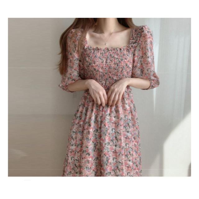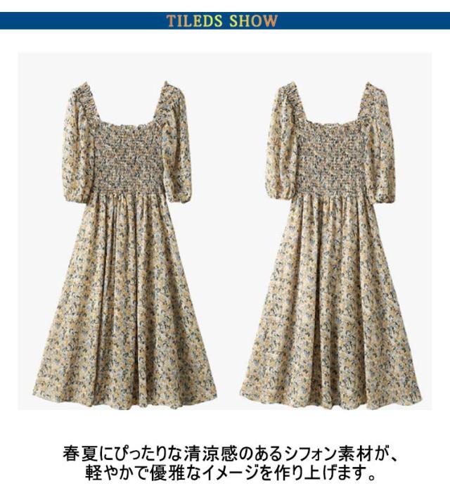 花柄ワンピース レディース スクエアネック サマードレス ロング マキシ丈ワンピース 半袖 シフォン ハワイ 沖縄 旅行用 大人 20代 30代 40代 可愛い お洒落 花柄 フェミニン 薄手 送料無料