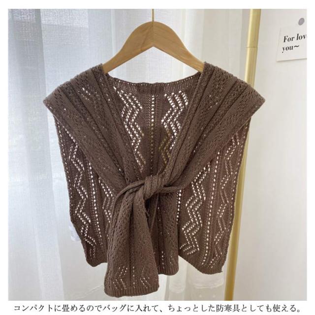 | つけるだけで華やぐ、肩掛けニット 透け感のある、柔らかなニットを軽く羽織っておしゃれにファッションを楽しんで♪ 色んな着こなしができるから、1枚持っていると重宝する。 簡単に装着可能で重ね着が苦手な方も気軽に挑戦できます。 冷房対策や季節の変わり目は洋服の調整が難しい!羽織るアイテムがお勧め。 コンパクトに畳めるのでバッグに入れて、ちょっとした防寒具としても使える。 | |