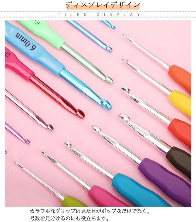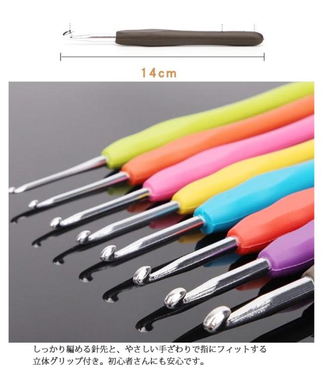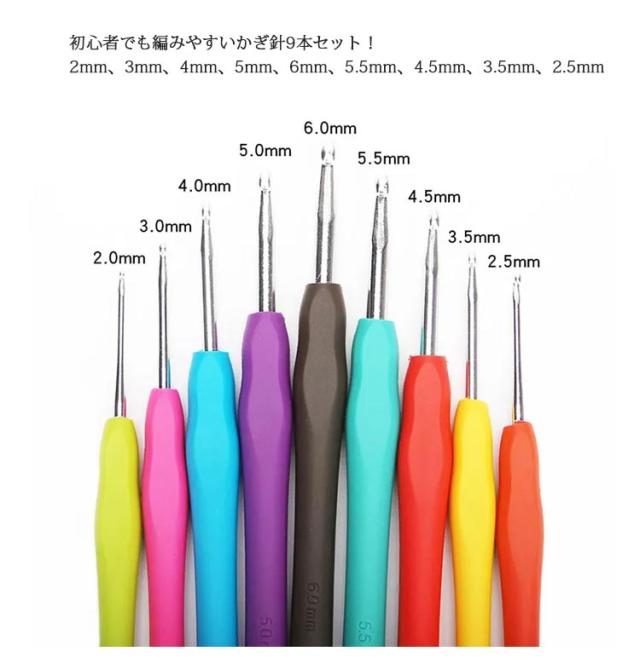 | 「編みやすい」「持ちやすい」かぎ針9本セット 初心者でも編みやすいかぎ針9本セット!2mm、3mm、4mm、5mm、6mm、5.5mm、4.5mm、3.5mm、2.5mm 針先から糸がはずれにくく、目を拾ったり、糸を引き抜きやすい針先形状です。 しっかり編める針先と、やさしい手ざわりで指にフィットする立体グリップ付き。初心者さんにも安心です。 カラフルなグリップは見た目がポップなだけでなく、号数を見分けるのにも役立ちます。 | |