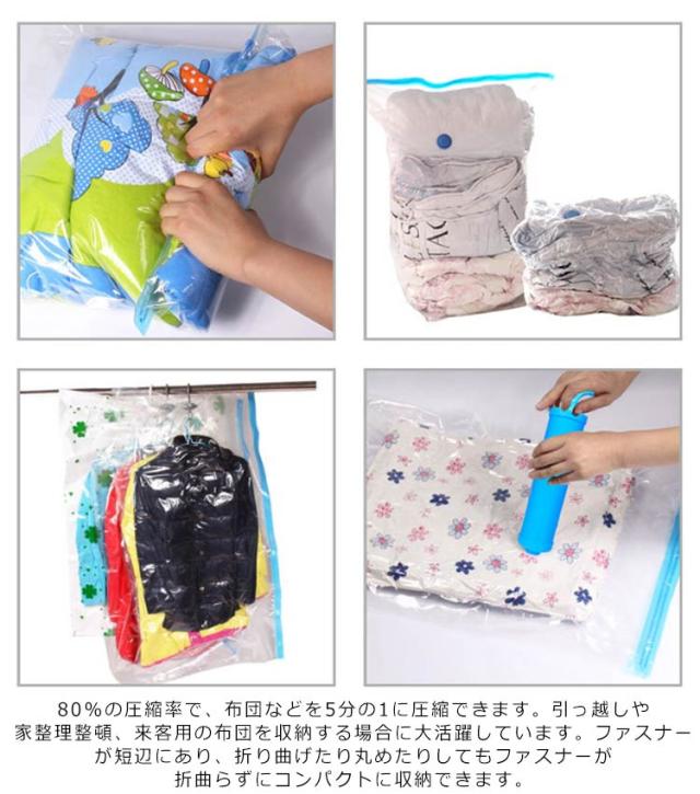 | 【より薄くなる】80%の圧縮率で、布団などを5分の1に圧縮できます。引っ越しや家整理整頓、来客用の布団を収納する場合に大活躍しています。ファスナーが短辺にあり、折り曲げたり丸めたりしてもファスナーが折曲らずにコンパクトに収納できます。 【より多く収納】約130×100cmの大きいサイズで、毛布、ぬいぐるみ、シングルサイズの掛ふとんと敷ふとん、ダブルサイズの掛ふとんなど様々なものを楽に収納できます。スライダーが一体型の圧縮袋なので、ファスナーを閉じる際にスライダーが外れてしまわず快適に閉じられます。 【より長く保存】ダブルファスナーで閉じ口が堅く閉まって空気漏れしにくいです。シリコン製の逆流防止弁も付くので空気の逆戻りがありません。一度圧縮しますと、長時間で真空状態になり、布団などをカビ、ホコリ、湿気、細菌などから守れます。4層のPE+PET素材で作られたので、破れにくくて、何度も繰り返し使えて耐久性があります。安全な素材で、ご心配なく使用できます。 【より速く圧縮】バルブ式なので、掃除機のノズルをバルブ部分にあてるだけで、複数のふとんを短時間で圧縮できます。女性や年配の方でも簡単に出来上がります。ティックタイプ、ハンディタイプ、コードレスタイプなどの特殊機種の掃除機では使用できませんので、ご購入する前に確認ください。 | |