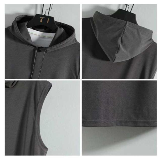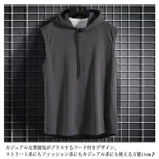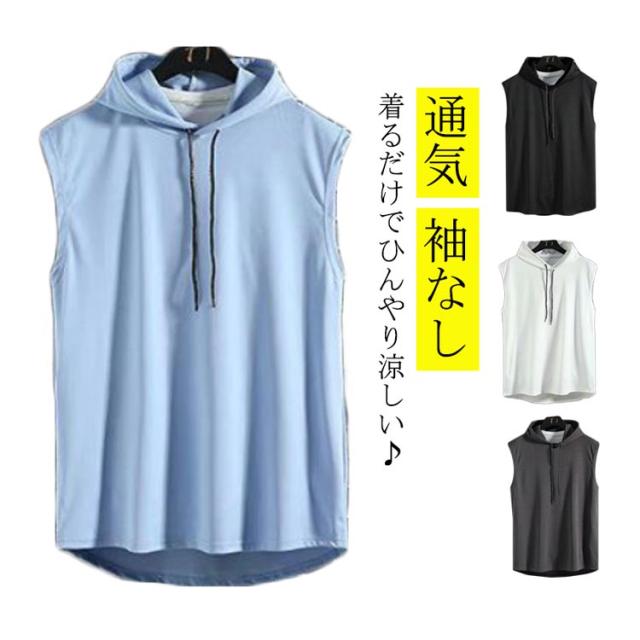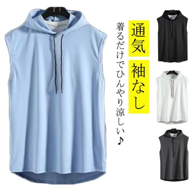パーカー メンズ ノースリーブ タンクトップ 接触冷感 送料無料 夏 薄手 プルオーバーパーカー 袖なし フード付き スウェット 通気 無地 スポーツウェア おしゃれ スポーツウェア ジム ランニングウェア