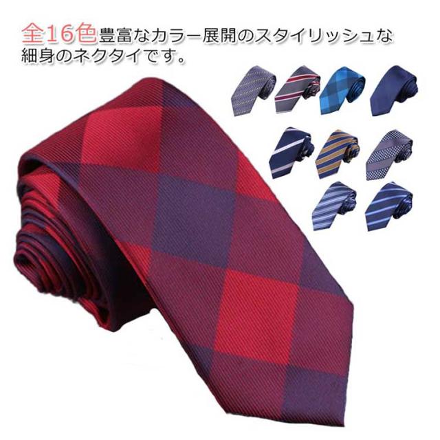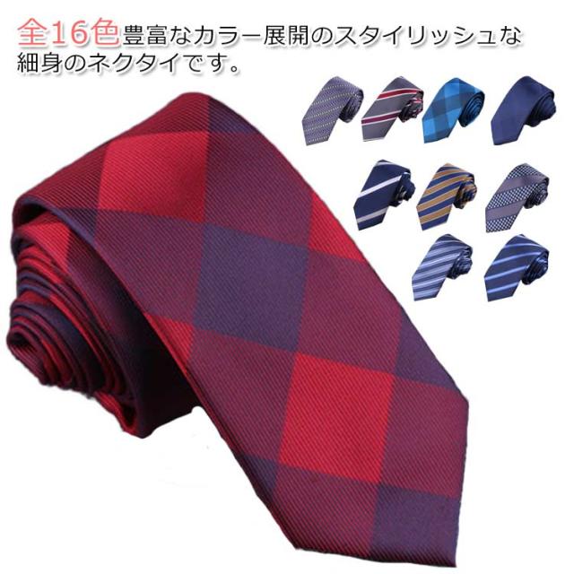 送料無料 全16色 メンズ ネクタイ 細身 スリムネクタイ ナローネクタイ ビジネス 6cm 就活 リクルート イベント チェック ストライプ ブルー ネイビー レッド