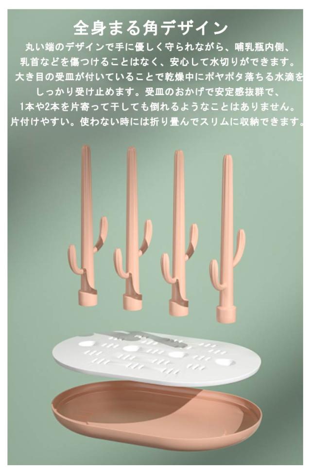 | 洗練されたデザインの哺乳瓶スタンド。 置くだけでキッチンが華やかに。 立体作りで場所取らない 12個スタンドですべての哺乳瓶を受け取ります。乳首の立体デザインでサイドテーブルを解放してくれます。 安心安全素材 高品質なABS、PP素材を採用しており、無臭、安全、錆びなく、抗菌レベルが抜群で、耐久性にも強いです。 厚いしっかりとした材質で加工されていますので、頑丈で安定性に優れます。防水仕様なので、暖かい水で洗えて、いつも清潔を保てます。 多機能乾燥ラック☆ 哺乳瓶に付属している小さな中フタ、乳首など、赤ちゃんのグッズはとにかく小さいもの。洗い籠の底に水に浸かった状態で見つかることがよくあります。赤ちゃんの哺乳瓶や周辺商品だけではなく、食器類やコップやグラスなどの水切りも幅広く活用できます。 乾燥早く、衛生的に 便利なオープンデザインにより、空気が自由に流れ、水の蒸発スピードをより速くなります。密封のタイプより乾燥効果がより抜群で、最も速く衛生的で最適な乾燥が得られ、細菌繁殖を防止、お互いの汚染を防げます。 全身まる角デザイン 丸い端のデザインで手に優しく守られながら、哺乳瓶内側、乳首などを傷つけることはなく、安心して水切りができます。大き目の受皿が付いていることで乾燥中にポヤポタ落ちる水滴をしっかり受け止めます。受皿のおかげで安定感抜群で、1本や2本を片寄って干しても倒れるようなことはありません。片付けやすい。使わない時には折り畳んでスリムに収納できます。 | |