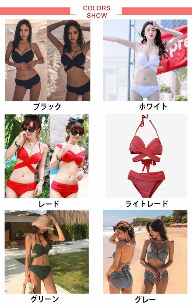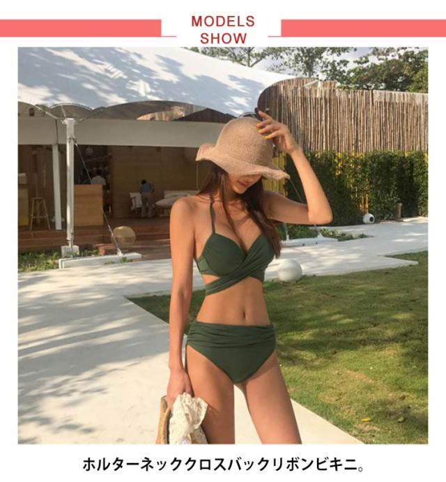 | シンプル!セクシー!6色から選べる!ホルターネッククロスバックリボンビキニ。 ホルターネック&胸元がクロスになっているビキニです。 小胸もしっかりカバーしてくれます。 今年の水着はバックスタイルがお洒落じゃないと! ストラップのバックリボンが大人かわいい! リボンで調整できるので、自分の体型にしっかりとフィットし着心地も抜群です。 フロントツイストのブラが寄せ上げ効果バツグン! セクシーな大人の魅力が素敵なビキニセットです。 | |