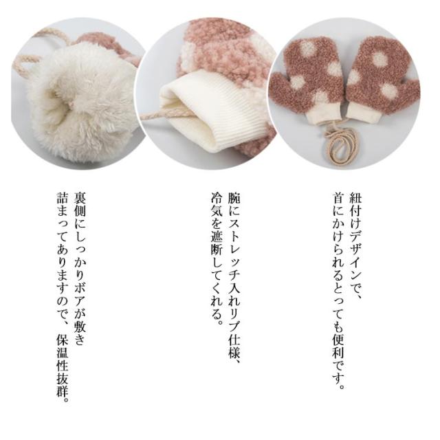 | 可愛い点々デザインのキッズ手袋! 肌触りがいい、身に付けば、とてもキュートです。 裏側にしっかりボアが敷き詰まってありますので、保温性抜群。 紐付けデザインで、首にかけられるとっても便利です。 腕にストレッチ入れリブ仕様、冷気を遮断してくれる。 寒い日にぴったりキッズ手袋。 | |