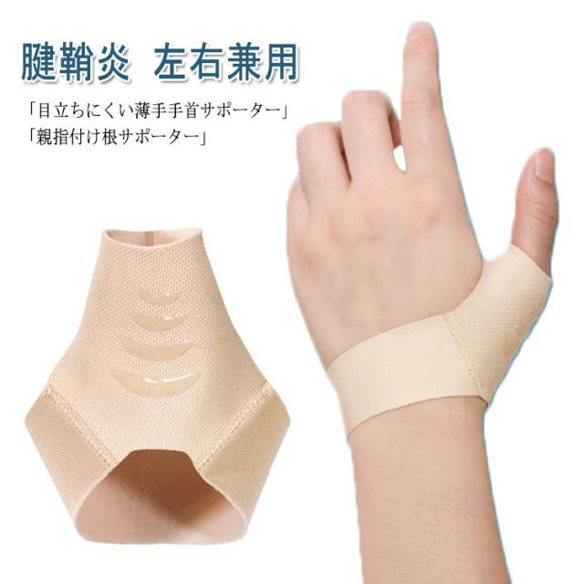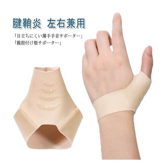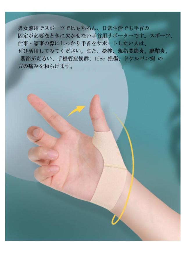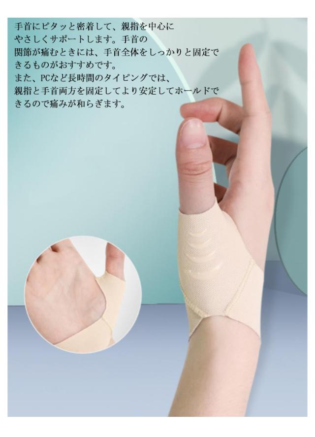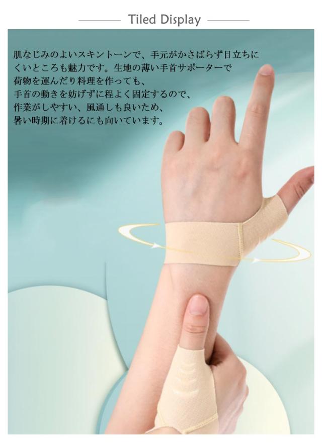 | 「目立ちにくい薄手手首サポーター」肌なじみのよいスキントーンで、手元がかさばらず目立ちにくいところも魅力です。生地の薄い手首サポーターで荷物を運んだり料理を作っても、手首の動きを妨げずに程よく固定するので、作業がしやすい、風通しも良いため、暑い時期に着けるにも向いています。 「親指付け根サポーター」手首にピタッと密着して、親指を中心にやさしくサポートします。手首の関節が痛むときには、手首全体をしっかりと固定できるものがおすすめです。また、PCなど長時間のタイピングでは、親指と手首両方を固定してより安定してホールドできるので痛みが和らぎます。 「多目的手首サポーター」男女兼用でスポーツではもちろん、日常生活でも手首の固定が必要なときに欠かせない手首用サポーターです。スポーツ、仕事・家事の際にしっかり手首をサポートしたい人は、ぜひ活用してみてください。また、捻挫、親指関節炎、腱鞘炎、 関節がだるい、手根管症候群、tfcc 損傷、ドケルバン病 の方の痛みを和らげます。 | |