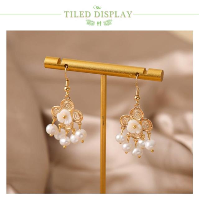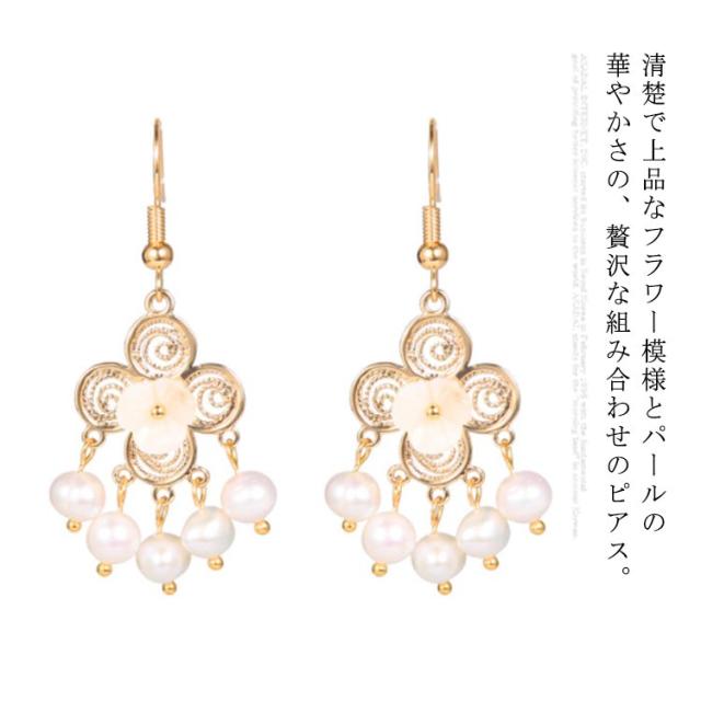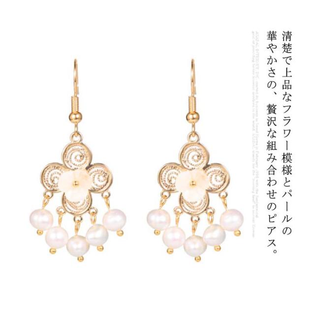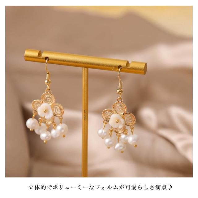 | 清楚で上品なフラワー模様とパールの華やかさの、贅沢な組み合わせのピアス。 立体的でボリューミーなフォルムが可愛らしさ満点♪ さらにさらに、フラワーモチーフに注目! 耳元に華やか・上品なアクセントになる5粒パールで上品さアップ。 結婚式やパーティー、もちろんデイリーにも楽しめます。 | |