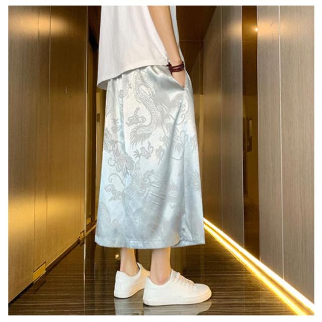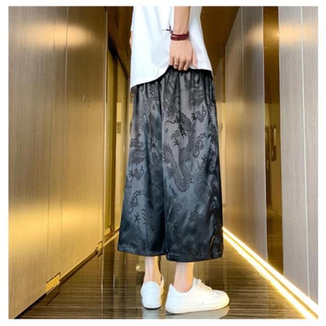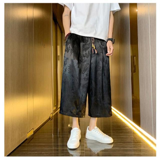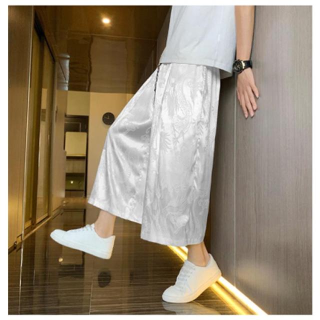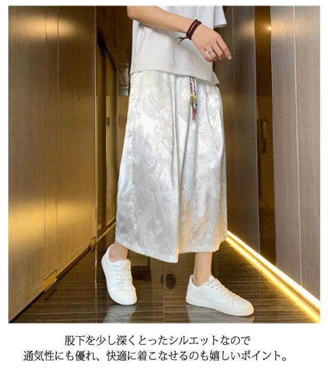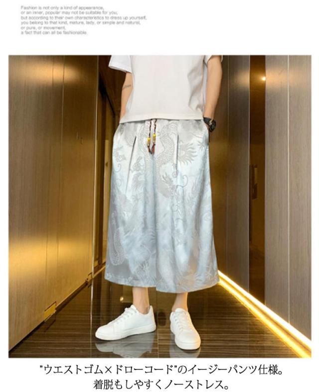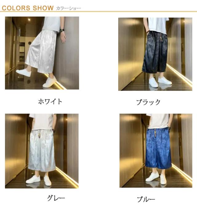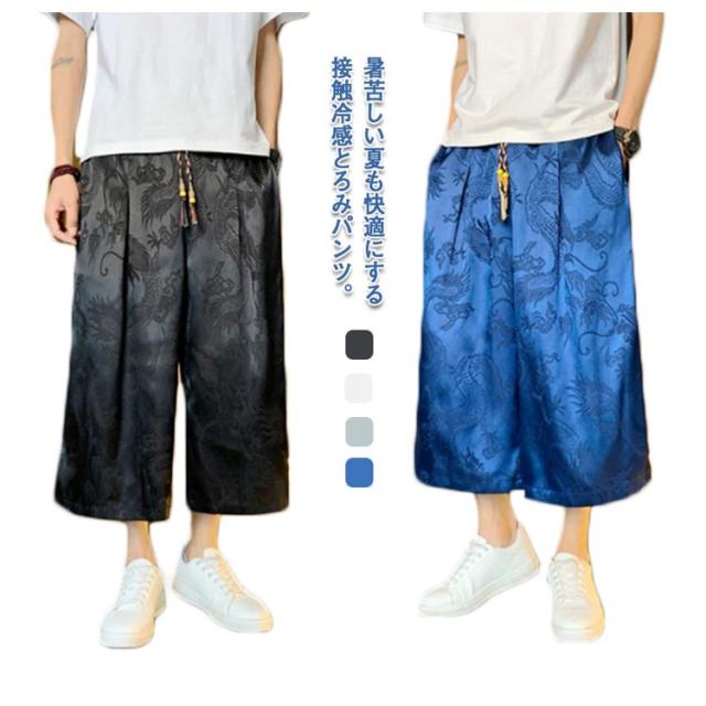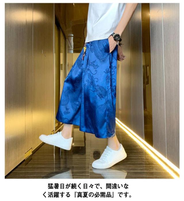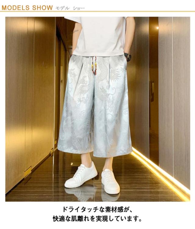 【送料無料】ワイドパンツ 7分丈 接触冷感 袴パンツ サルエルパンツ スカートパンツ 夏 メンズ 薄手 光沢感 落ち感 ゆったり スカンツ モード とろみ ルーズ 総柄 春 秋 ゴムウエスト ポケット付き 大きいサイズ