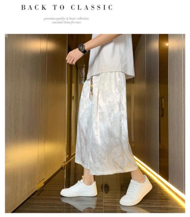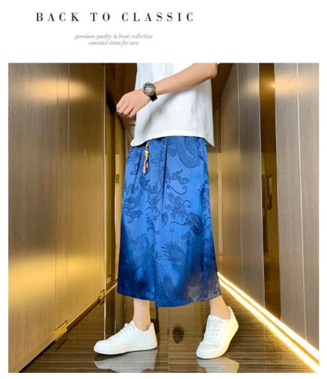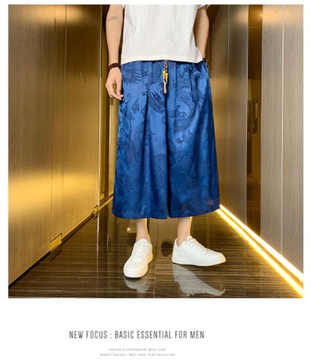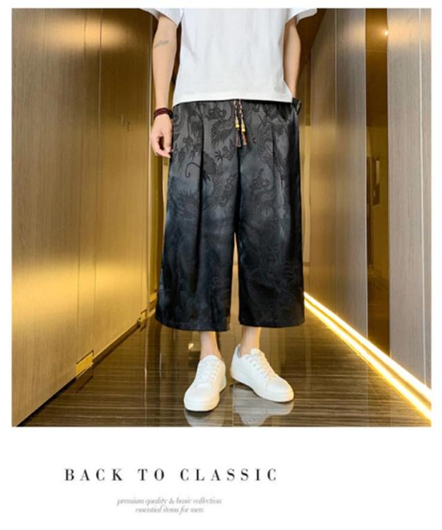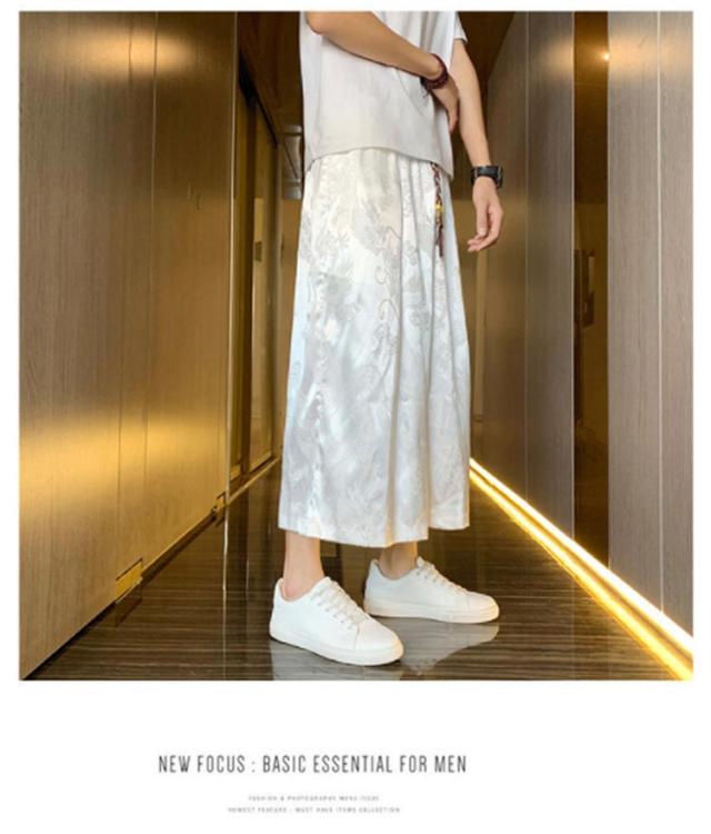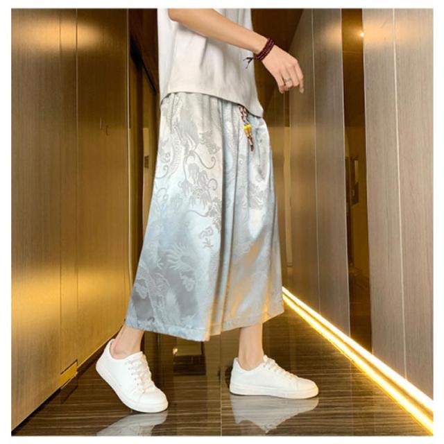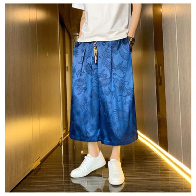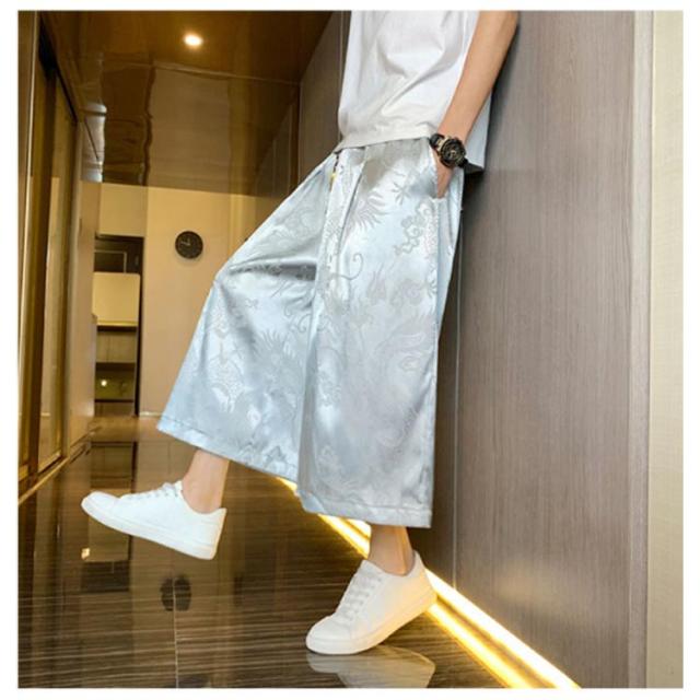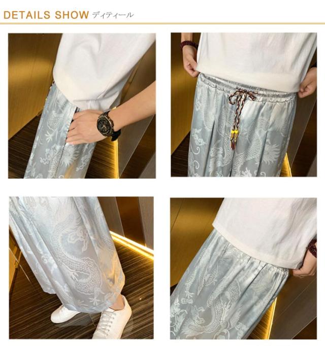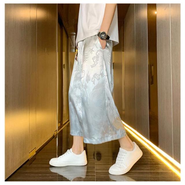 【送料無料】ワイドパンツ 7分丈 接触冷感 袴パンツ サルエルパンツ スカートパンツ 夏 メンズ 薄手 光沢感 落ち感 ゆったり スカンツ モード とろみ ルーズ 総柄 春 秋 ゴムウエスト ポケット付き 大きいサイズ