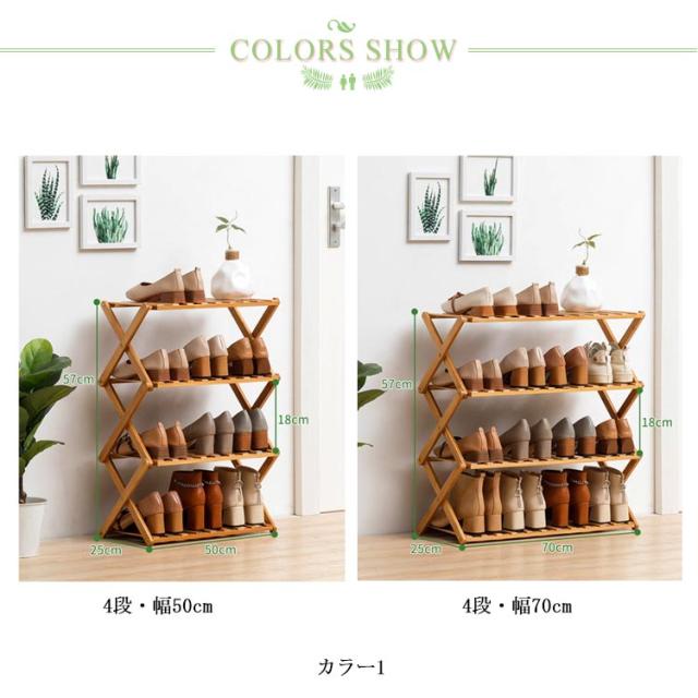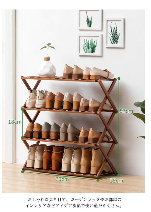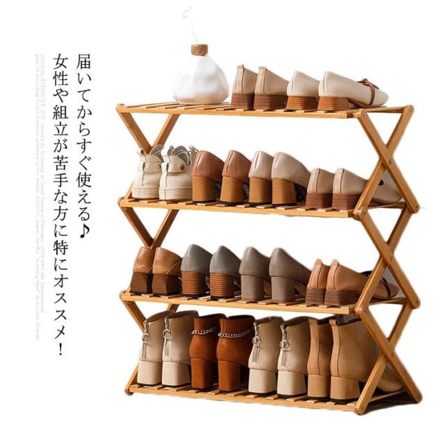 すぐ使える♪ シューズラック 4段 玄関収納 靴箱 オープンラック 組立不要 折りたたみ式 靴棚 花置き 伸縮 組立不要 竹製 収納棚 ラック