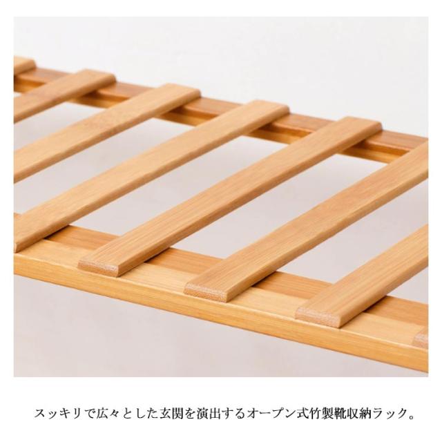| 届いてからすぐ使える♪女性や組立が苦手な方に特にオススメ! 広げてすぐ使えるおしゃれな折りたたみ式シューズラック。 使わない時はコンパクトに折りたたんで収納場所に困らない。持ち運びもラクラク。 メンズシューズやブーツ、ハイヒールパンプスなどいろんなシューズを収納できるオープン式で、湿気やいやな臭いがこもらない。 スッキリで広々とした玄関を演出するオープン式竹製靴収納ラック。 おしゃれな見た目で、ガーデンラックやお部屋のインテリアなどアイデア次第で使い道がたくさん。 | |