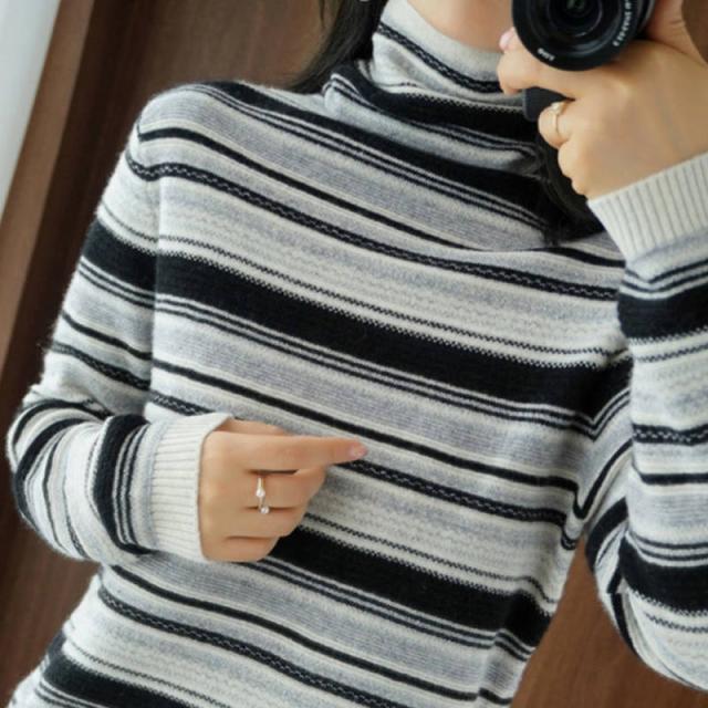 ウール混 ニット レディース 冬 セーター ハイネック カラフル ボーダー 長袖 秋冬 秋 冬 トップス 細身 タイト カットソー 大きいサイズ S-3XL