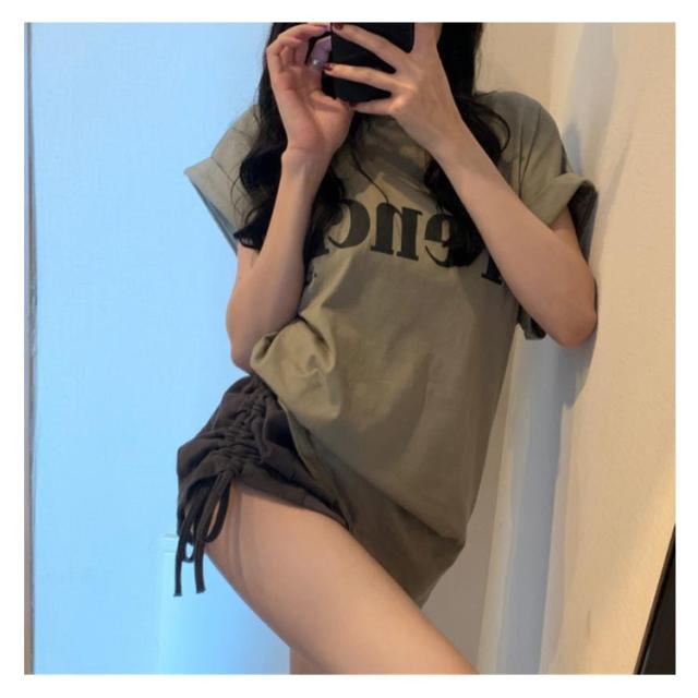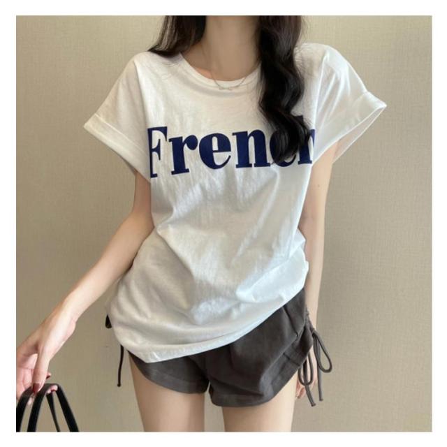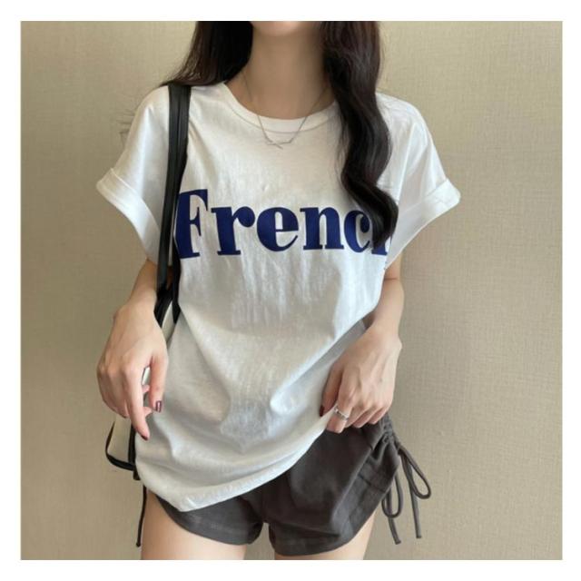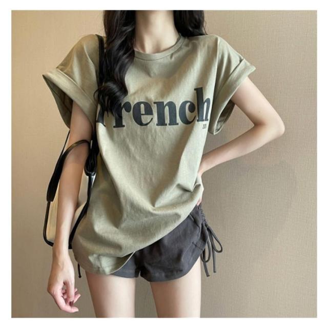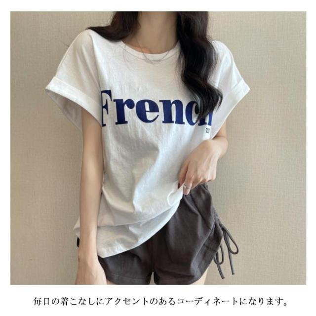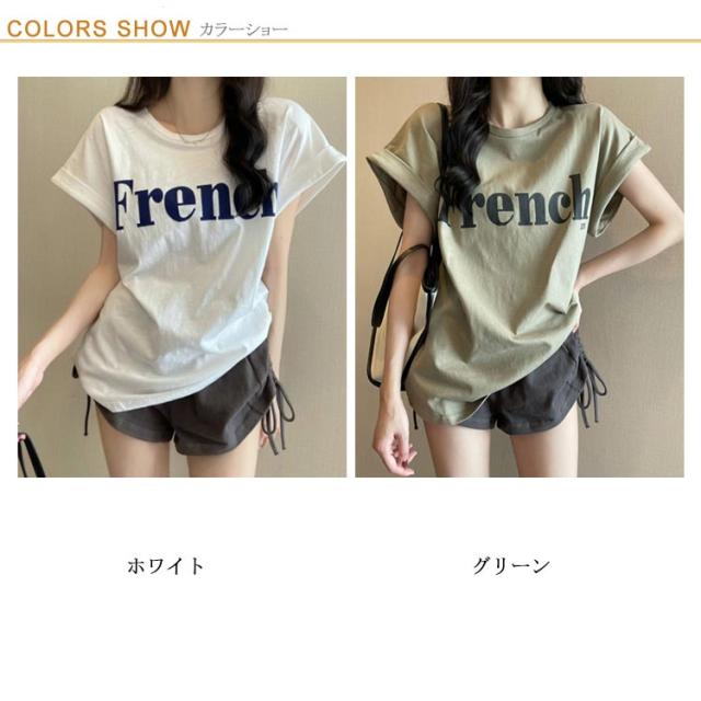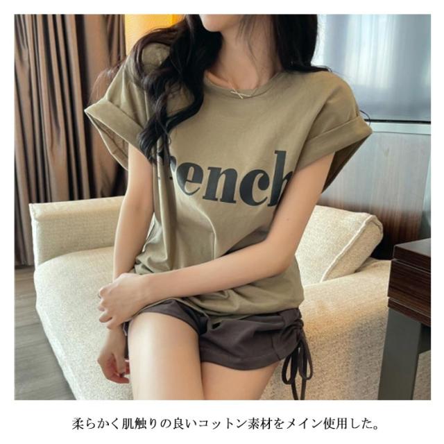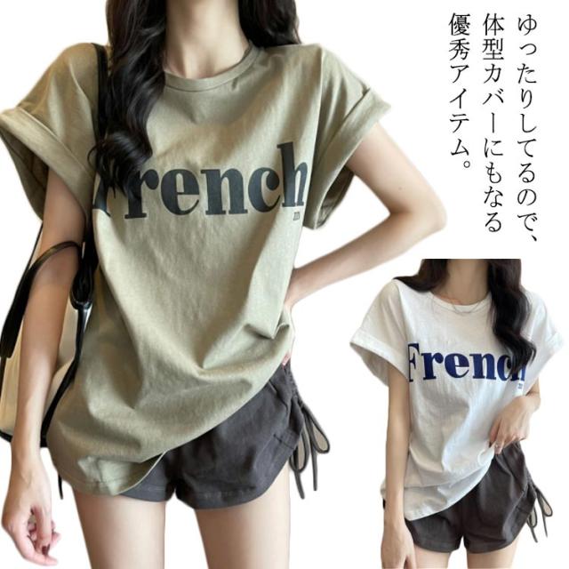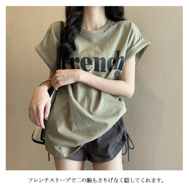 tシャツ フレンチスリーブ レディース ゆったり 半袖Tシャツ 夏 トップス シンプル 綿 おしゃれ プリントTシャツ ロゴTシャツ カジュアル かわいい カットソー 白 カーキ 大きいサイズ ゆるT ティーシャツ クルーネック 送料無料