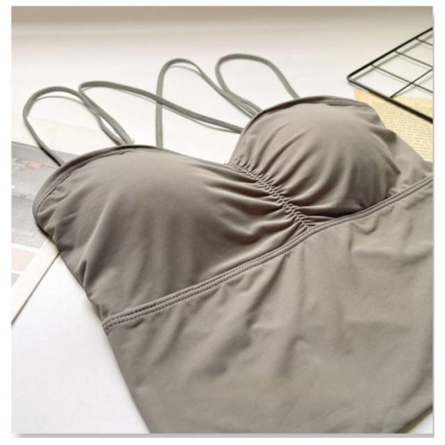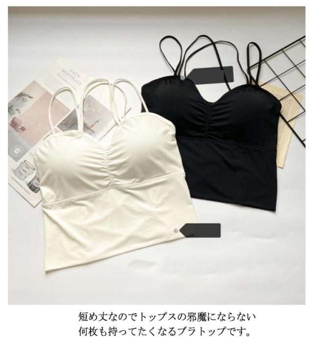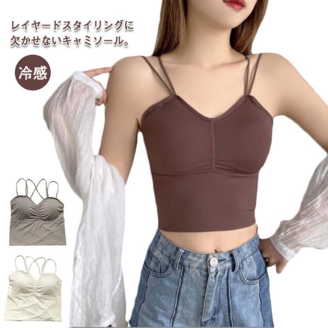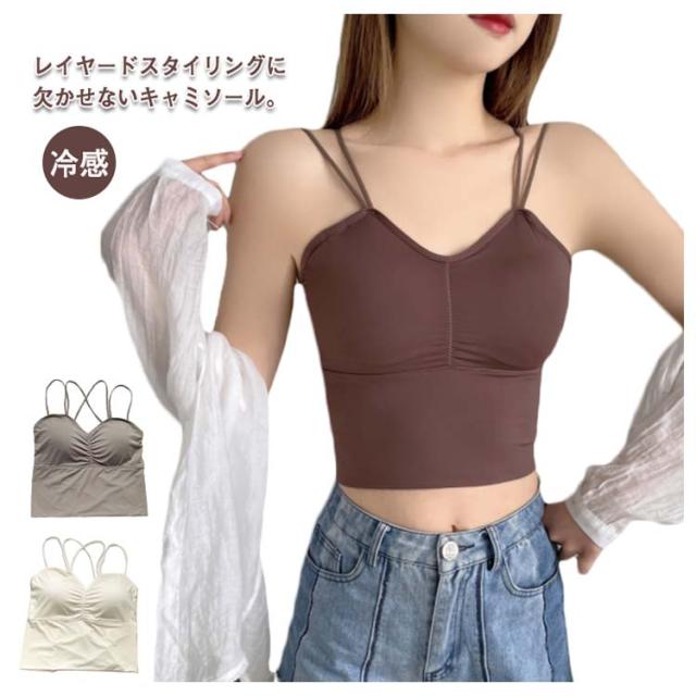 | レイヤードスタイリングに欠かせないキャミソール。 華奢なストラップは背部をセンシュアルにメイクするクロスデザインになっています。 カップ付きなので1枚でも安心して着ていただけます。 短め丈なのでトップスの邪魔にならない何枚も持ってたくなるブラトップです。 伸縮性のある柔らかい通気性がある素材を使用しているため汗を素早く乾かす。 肌の露出が増えるこれからのシーズンは、レイヤードインナーとして大活躍。 パッド付き、型崩れやズレ落ちを防ぎ、胸部をしっかり包み込んで持ち上げます。 | |