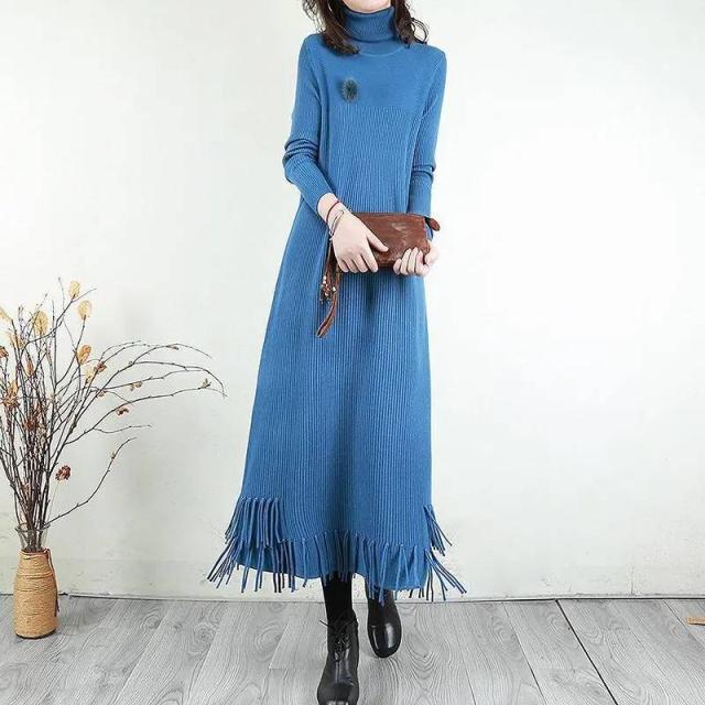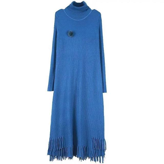 全4色×6サイズ フリンジ付き ニットワンピース ワンピース 秋冬 ロングワンピース タートルネック 長袖 大きいサイズ ゆったり きれいめ M-4XL