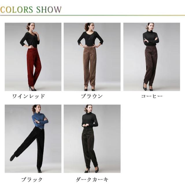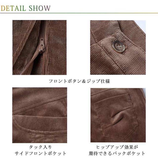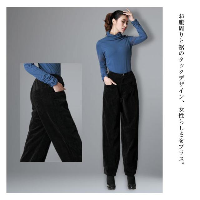 | キレイなシルエットが魅力♪ ボリュームしすぎないまあるいシルエットがスッキリ、トップスを選ばない。 脚ラインを拾わない程よいルーズ感、脚長・美脚効果抜群。 お腹周りと裾のタックデザイン、女性らしさをプラス。 人気のコーデュロイ素材を採用し、これからの季節から春までロングシーズン活躍するから重宝します。 | |