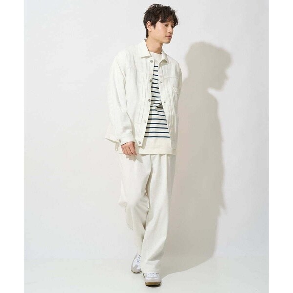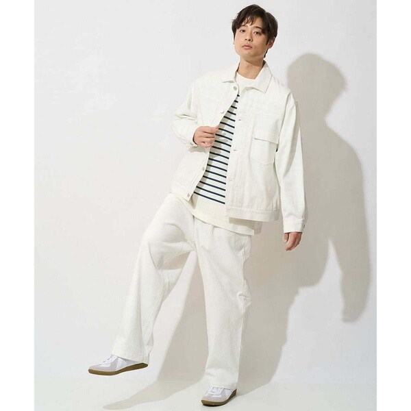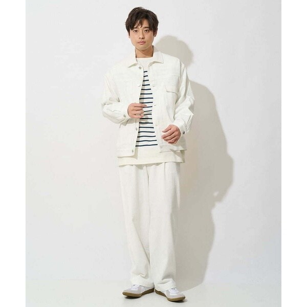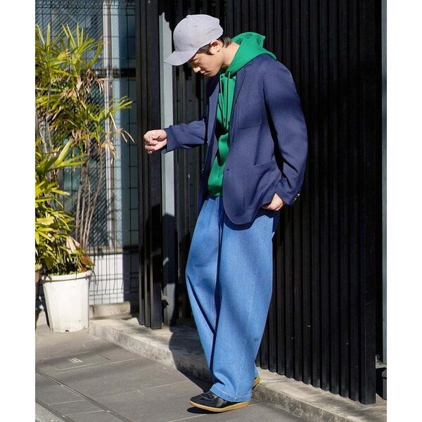 同素材のデニムジャケット合わせで同色のセットアップコーディネートがまとまりがありトレンド感が満載です。カットソー、シャツ、ニットなど様々なアイテムに合わせられる万能アイテムです。