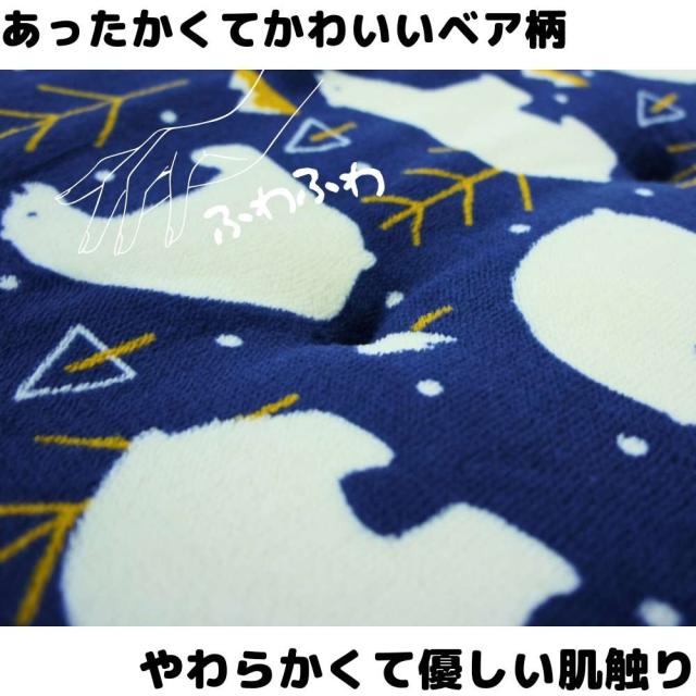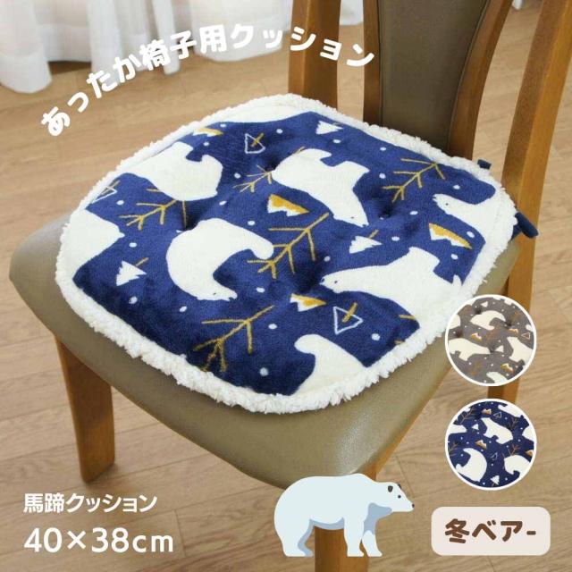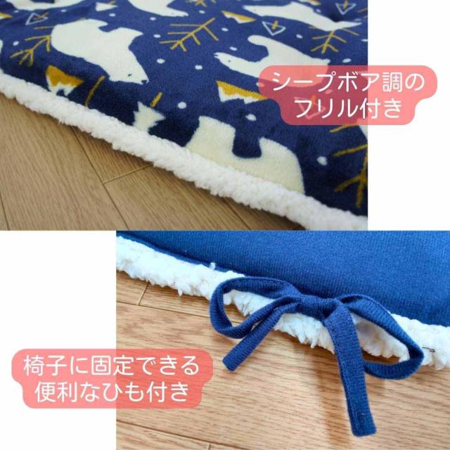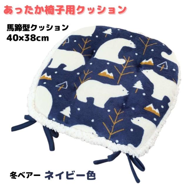 椅子用クッション 馬蹄型 かわいいベア柄 ネイビー色 40x38cm ひも付き かわいいフリル付 冬用
