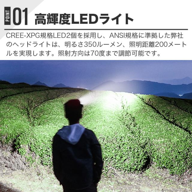 【高輝度LEDライト|超軽量で防水】CREE-XPG規格LED2個を採用し、ANSI規格に準拠した弊社のUSB充電式ヘッドライトは、明るさ350ルーメン、照明距離200メートルを実現します。夜間走行、夜釣り、登山などのアウトドア活動時に長時間装着しても頭が痛くなりません。防水等級「IPX45」で、日常的な使用や小雨やほこりへの心配はありません。