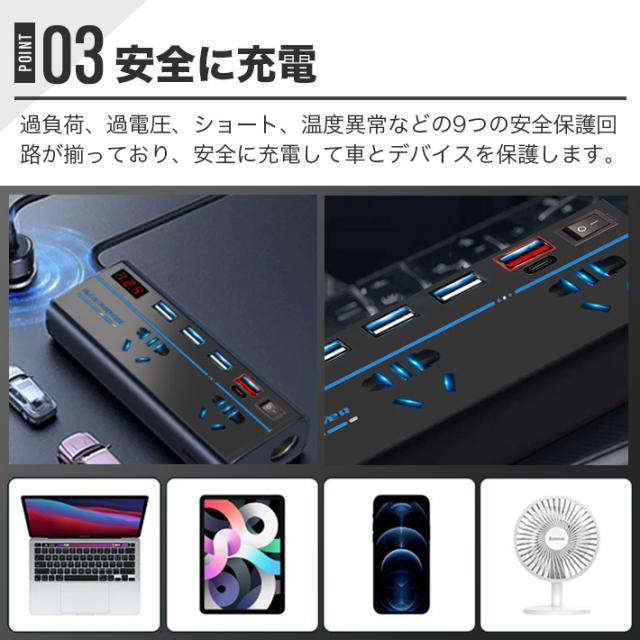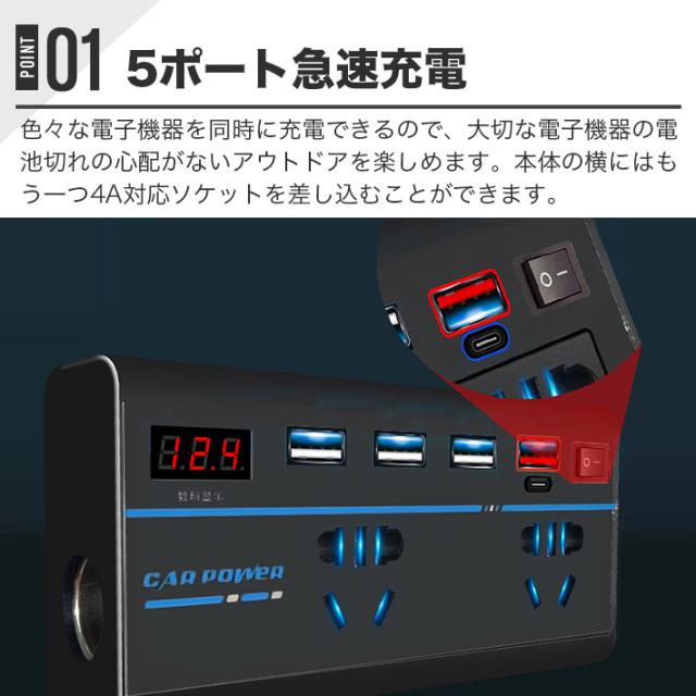日本仕様 200W 5ポート カーインバーター コンバーター シガーソケット コンセント 変換 車載充電器 車コンセント 車載インバーター 電源タップ タイプC スマホ充電