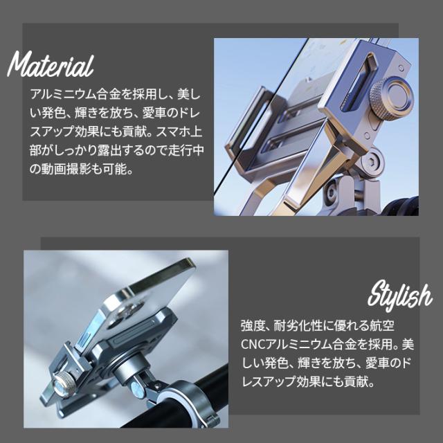 強度と耐久性に優れる航空CNCアルミニウム合金を採用。美しい発色と輝きを放ち、愛車のスタイリングに貢献します。スマートフォンの上部がしっかり露出し、走行中に動画撮影も可能です。挟む構造を採用してホルダーサイズをコンパクトに保ち、ハンドル回りのデザイン性に影響を与えません。