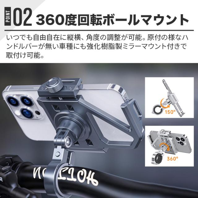 アルミ製のボールマウントと強化樹脂製のキャッチ、ナットは高精度で作られ、バイクや自転車の振動にもしっかりと姿勢を保ち、安定感を提供します。いつでも自由に縦横の角度を調整でき、ハンドルバーのない車種にも強化樹脂製のミラーマウントを使用して取り付けできます。