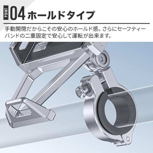【ホールドタイプ】精密設計のホルダー開閉機構がスムーズでしっかりとスマートフォンを保持します。開閉ダイヤルを2〜3回転させるだけで取り外せ、最小限の開閉で片手で取り外せます。手動開閉方式なので、安心のホールド感をぜひお試しください。さらに、セーフティーバンドの二重固定で安全に運転できます。アルミニウム合金を使用し、美しい発色と輝きを持ち、愛車のスタイリングにも貢献します。スマートフォンの上部がしっかり露出するため、走行中に動画撮影も可能です。対応機種:iPhone 14 Pro Max/13 Pro Max/13 Pro/13/12 Pro Max/12 Pro/12/11 Pro Max/11 Pro/11/XS Max/XR/X/8 Plus/8/7 Plus/7/SE/SAMSUNG Galaxy S9/S9 Plus/Note 8/S8/S8 Plus/Sony/Huawei/Google Pixelなど4-7インチ※スマートフォンケースの形状にご注意ください。