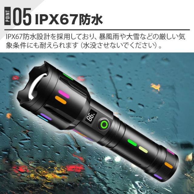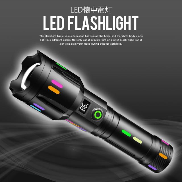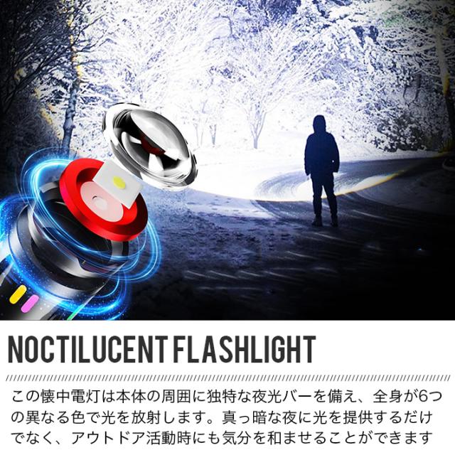 【新型発光効果設計 & 実用的なLED輝度】この懐中電灯は本体の周囲に独特な夜光バーを備え、全身が6つの異なる色で光を放射します。真っ暗な夜に光を提供するだけでなく、アウトドア活動時にも気分を和ませることができます。光カップとレンズの間には、同様に光を吸収する蛍光体が配置され、真っ暗な夜に速やかに環境を明るくし、緊急時や屋外での活動に最適です。この明るいLED懐中電灯には、SBT 50W LEDが使用され、最大4000ルーメンの明るさを提供します。さらに、最適化された専用PMMAリフレクターが採用され、最大700メートルの照射距離を実現します。