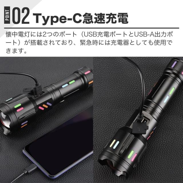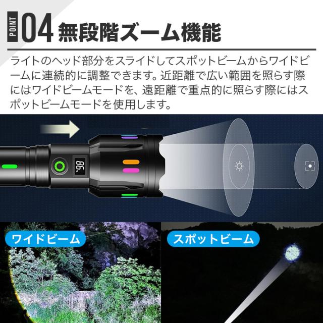 最新液晶画面 夜光懐中電灯 LED 強力 4000ルーメン 超高輝度 無段階ズーム機能 充電電池 ハンディライト USB充電式 超長遠射 超強力 ズーム機能 手持ちライト