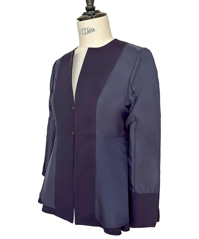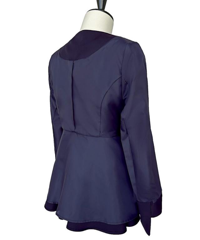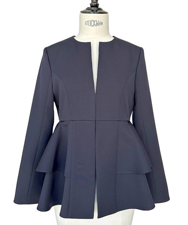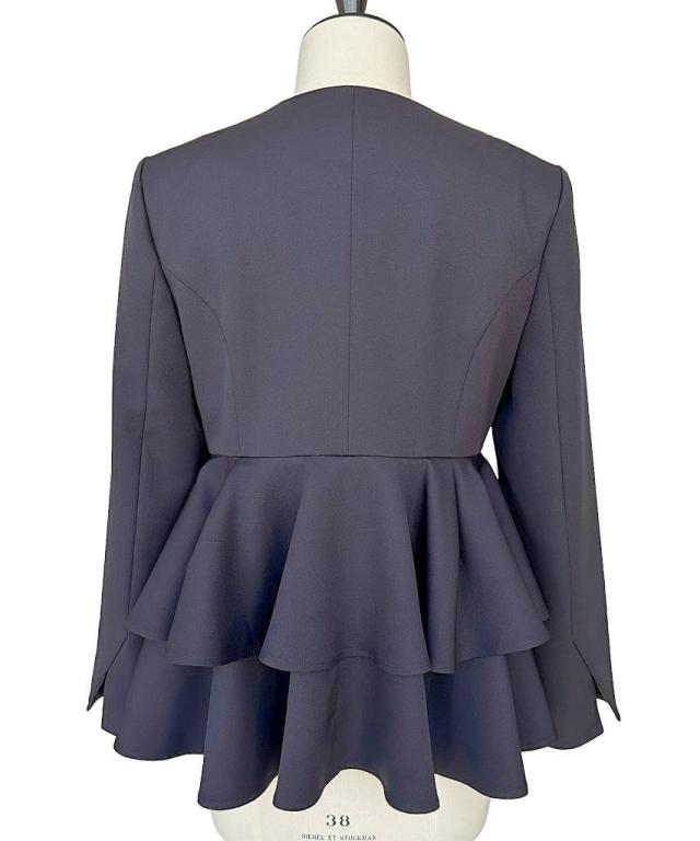フロントウエストはすっきり、サイドからバックまでの立体的な2段のペプラムフリルが華やかなノーカラージャケット。