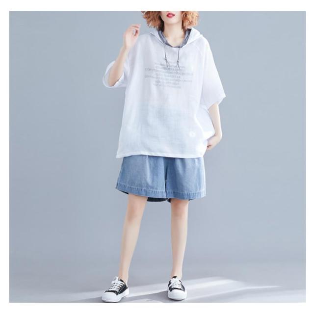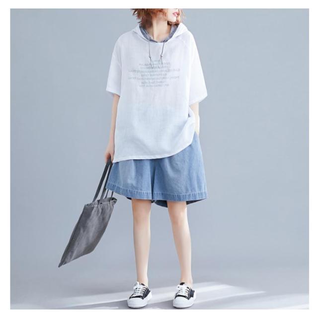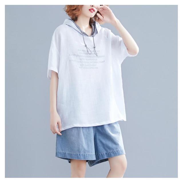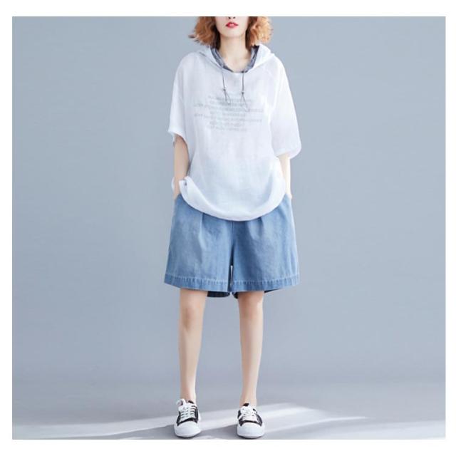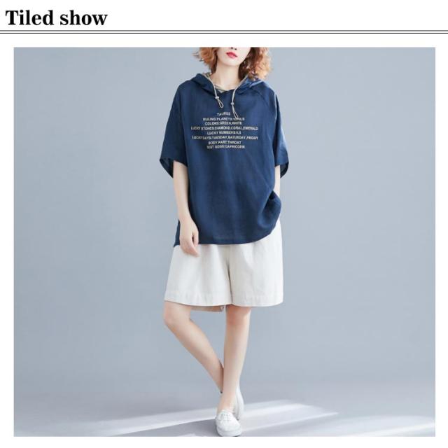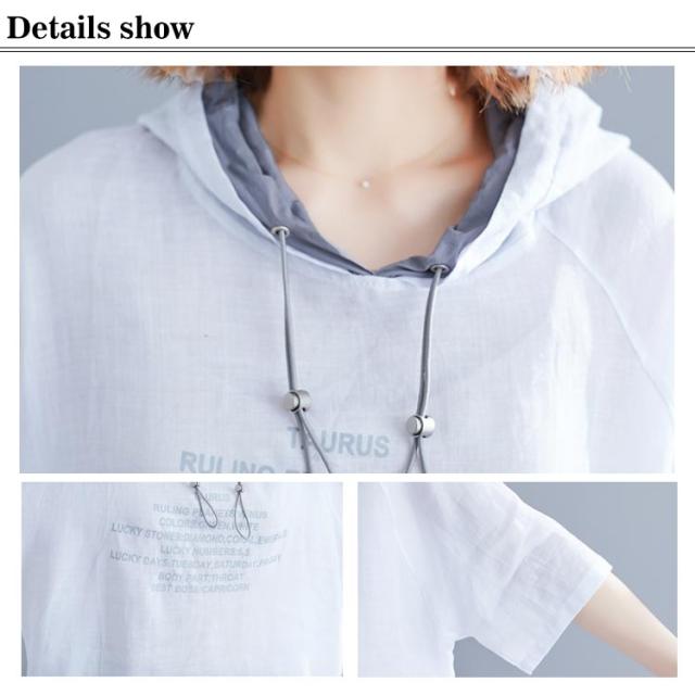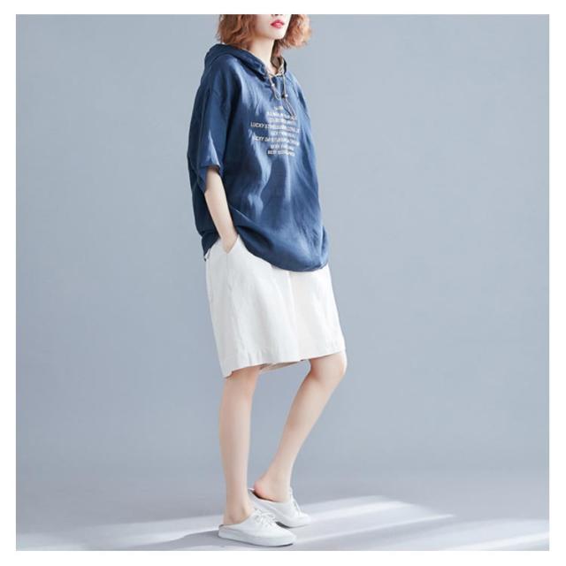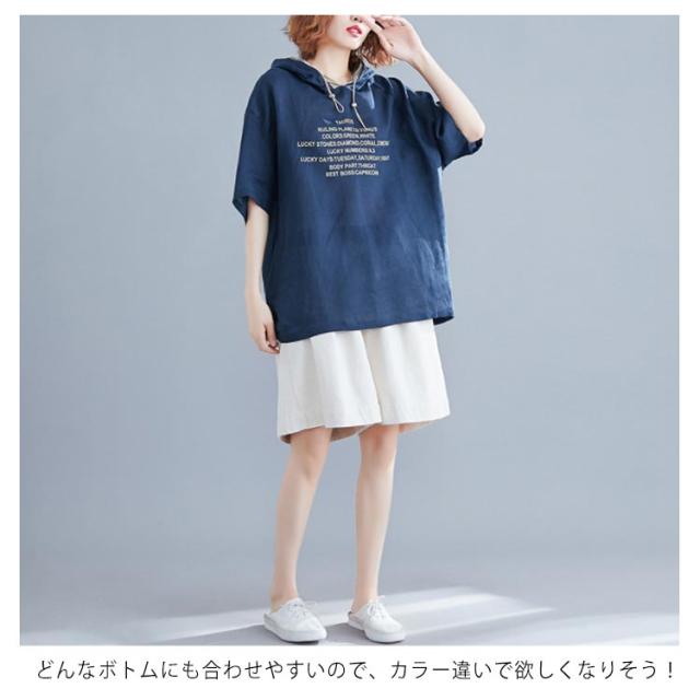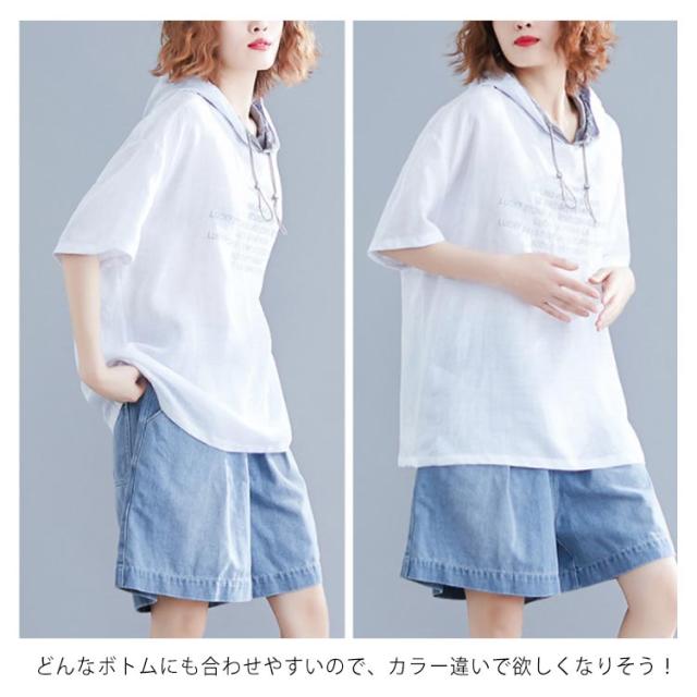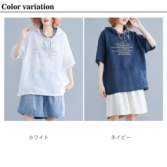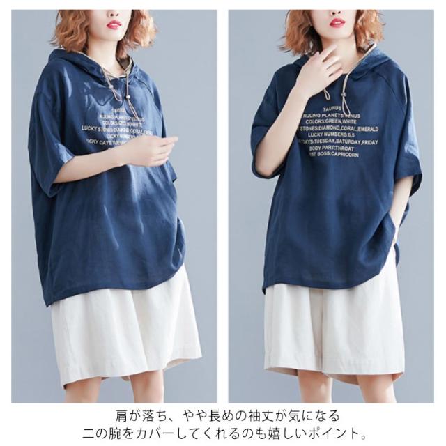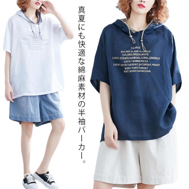 半袖 パーカー 綿麻 プルオーバーパーカー 五分袖 フード付 リネンtシャツ レディース リネン混 パーカ トップス プリント 大きいサイズ ゆったり 体型カバー オシャレ 涼しい 薄手 春夏 送料無料