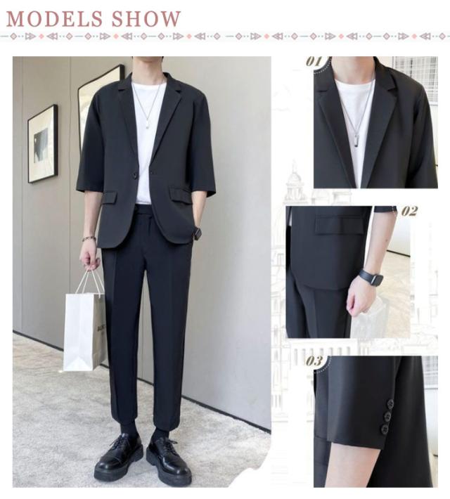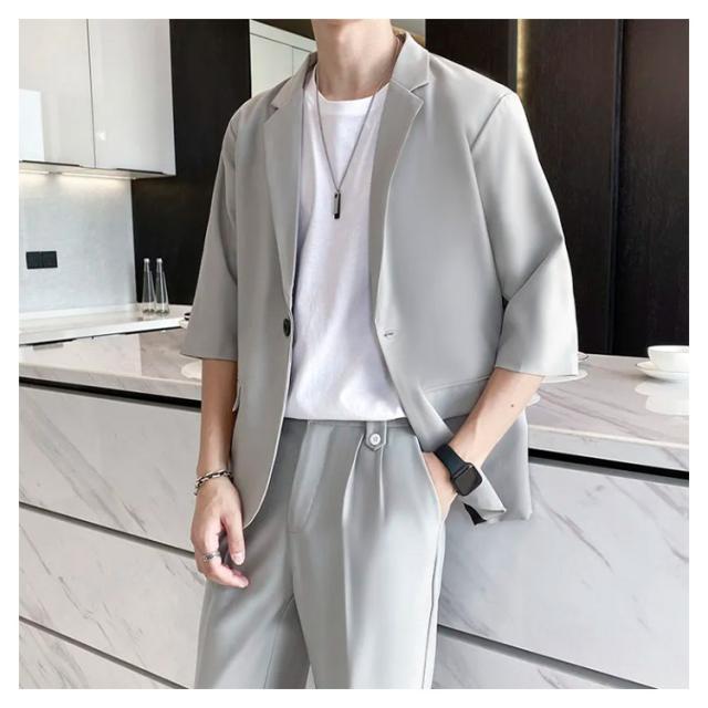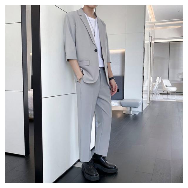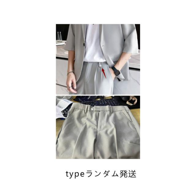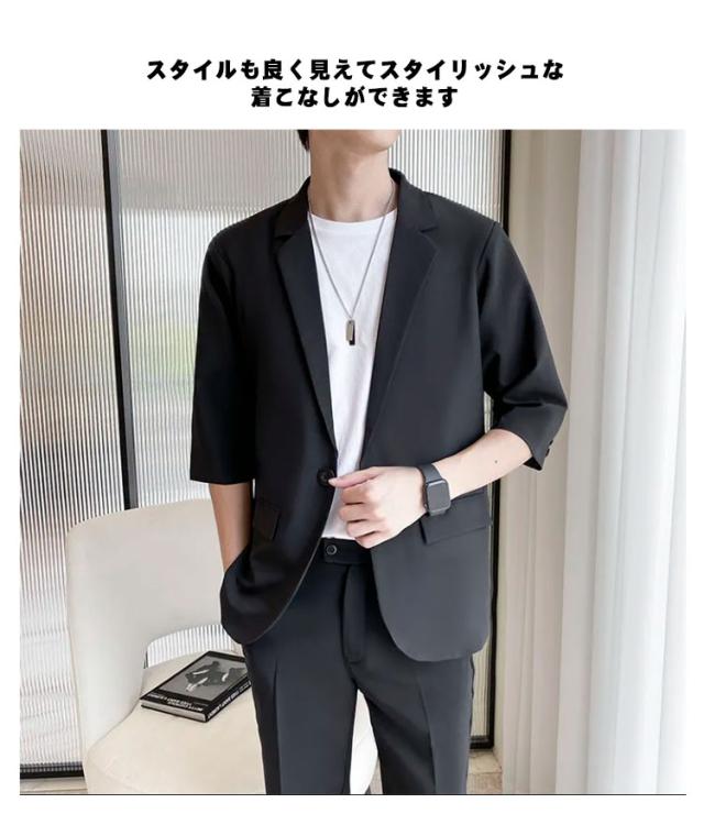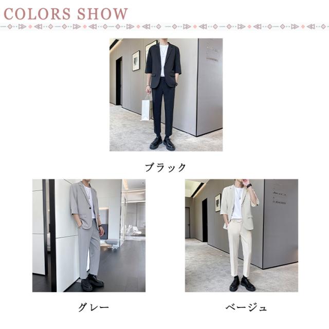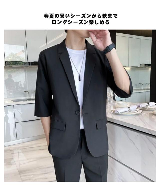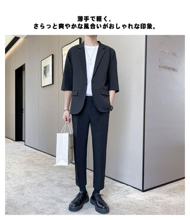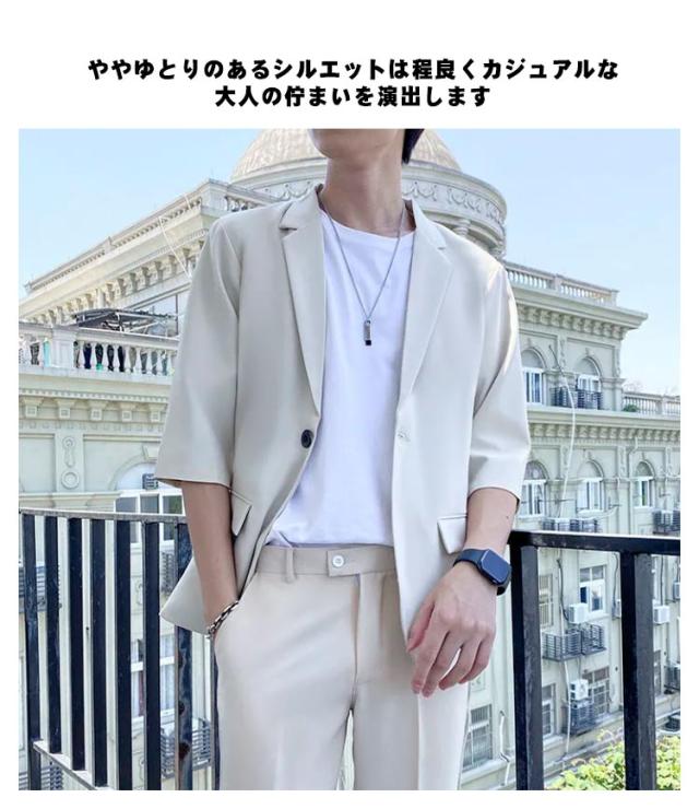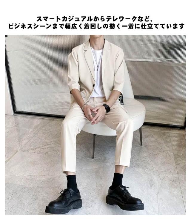 7分袖 テーラードジャケット セットアップ メンズ パンツ スーツ 夏 春 秋 スラックス パンツ 上下セット ビジネス カジュアル テレワーク 軽い 薄い 黒 大きいサイズ クールビズ ビジカジ 一つボタン グレー ベージュ 送料無料