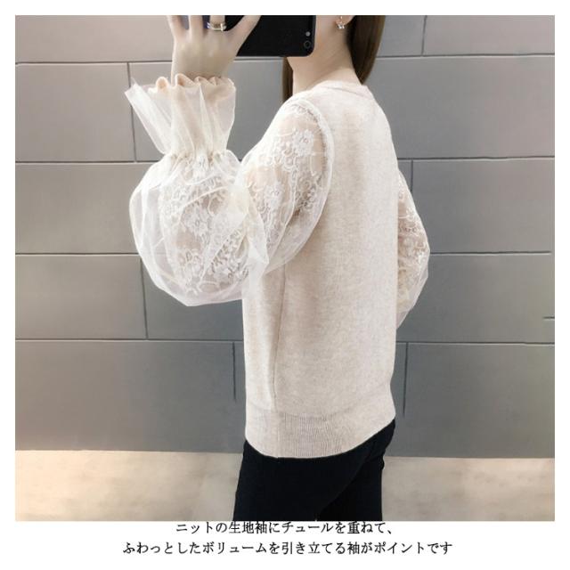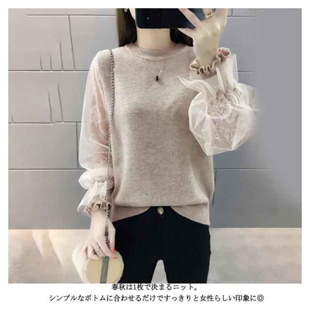 【送料無料】パフ袖 リブニット セーター レディース レース チュール ファッション クルーネック もっちり 春 秋 秋服 冬 丸首 ぽわん袖 パフ袖 バルーン袖 細身 無地 シンプル 上品