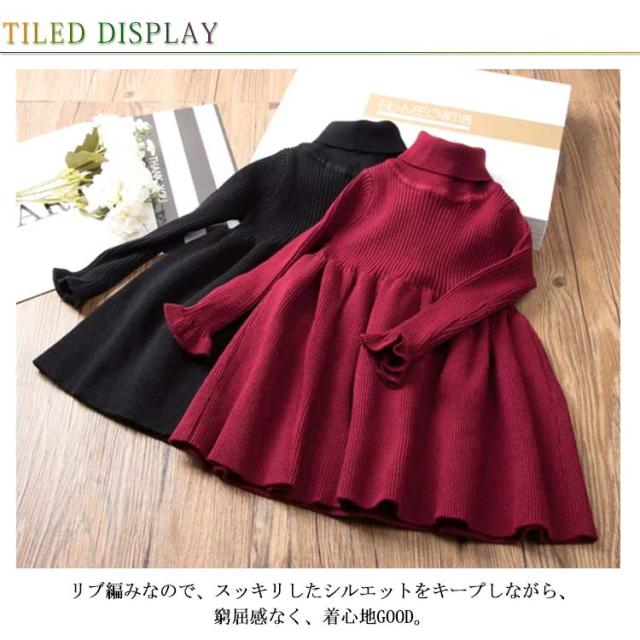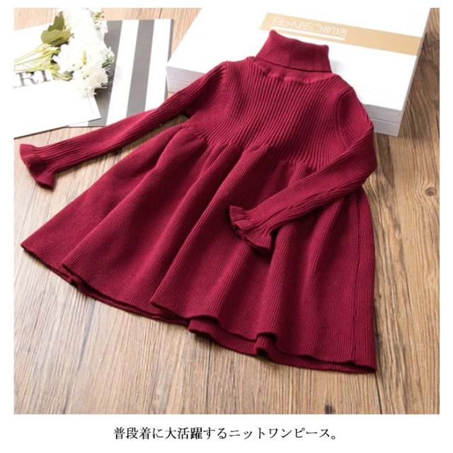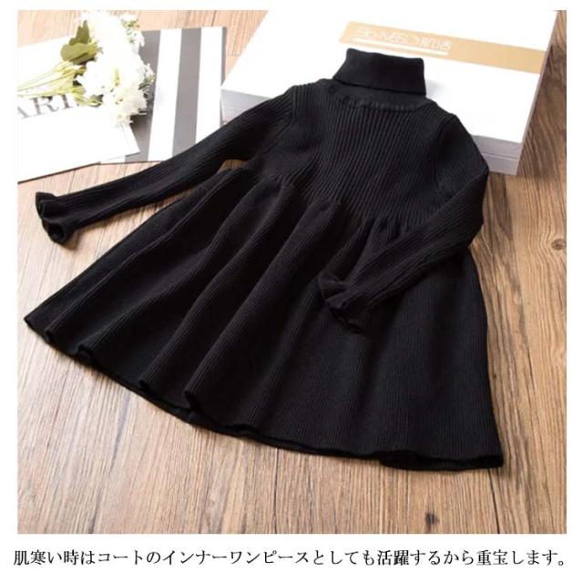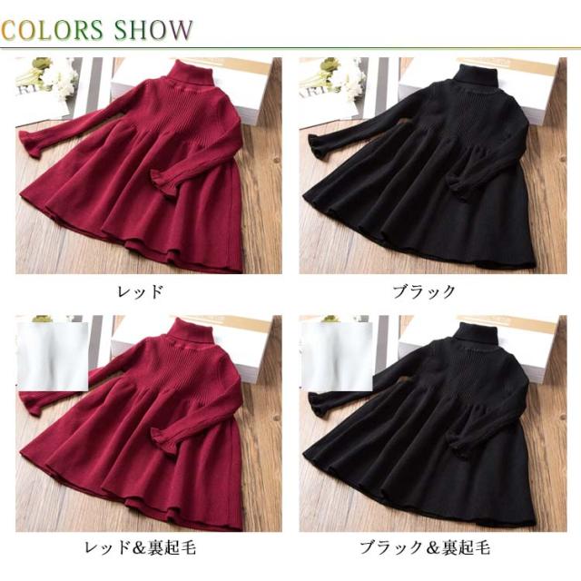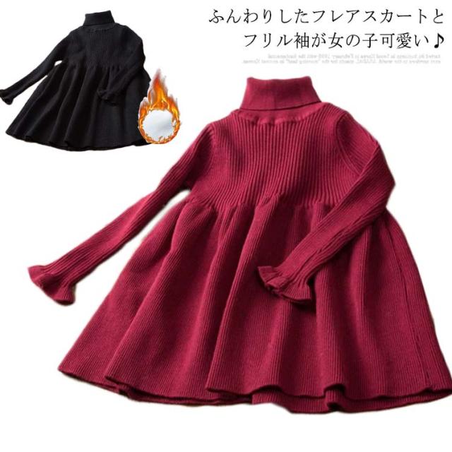 ニットワンピース 子供服 キッズ ジュニア フリル 長袖 ワンピース リブニット フレアワンピース 裏起毛 ハイネック 女の子 90 100 110 120 130 140 150 160 秋服 冬物