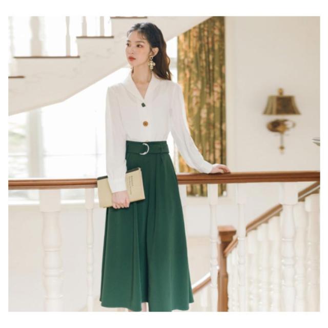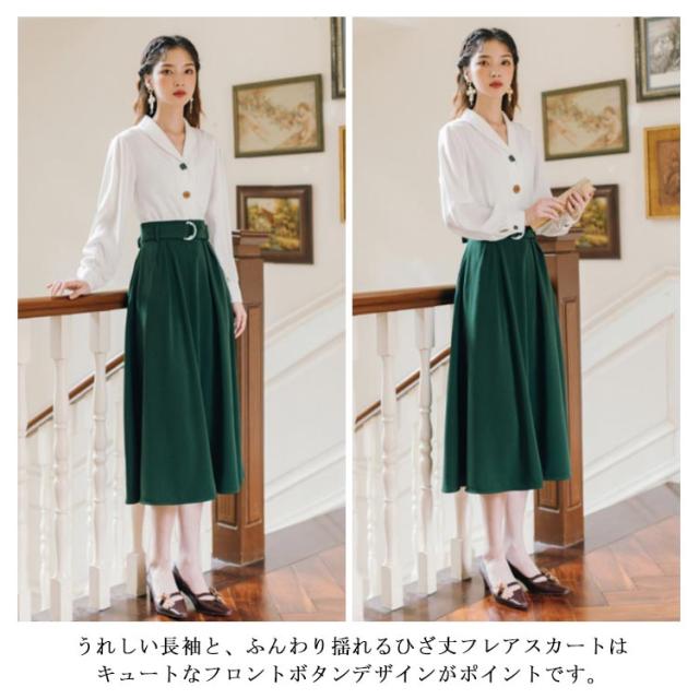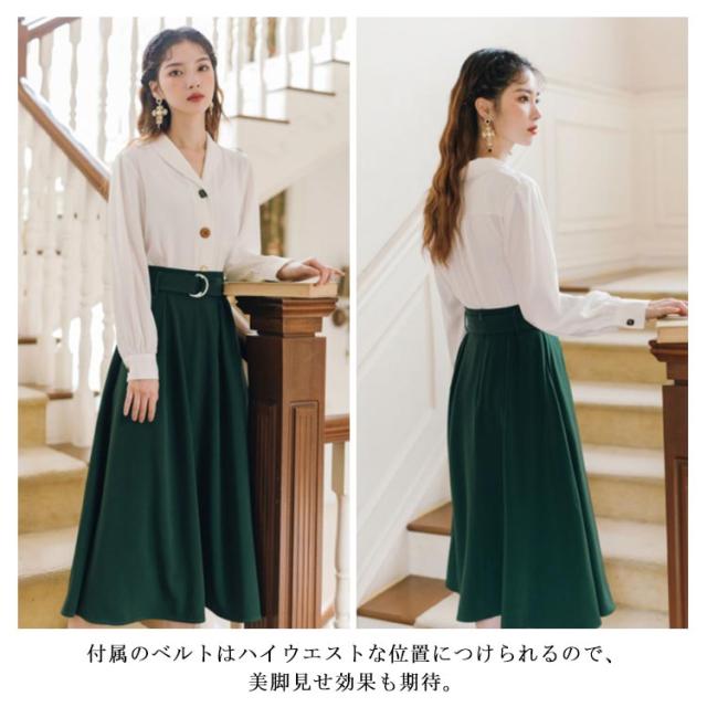 ドッキングワンピース シャツワンピース ミドル丈 vネック 長袖 フレアスカート フロントボタン ベルト付き オフイス 通勤 フェミニン エレガント 新作