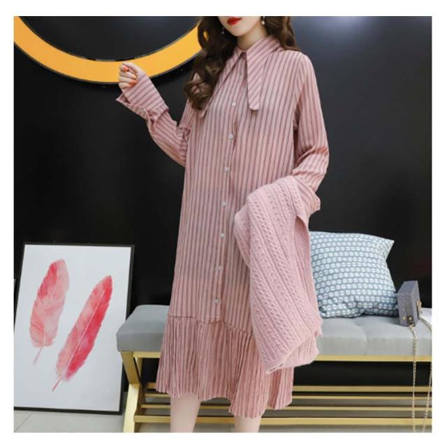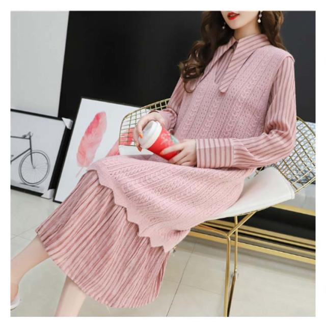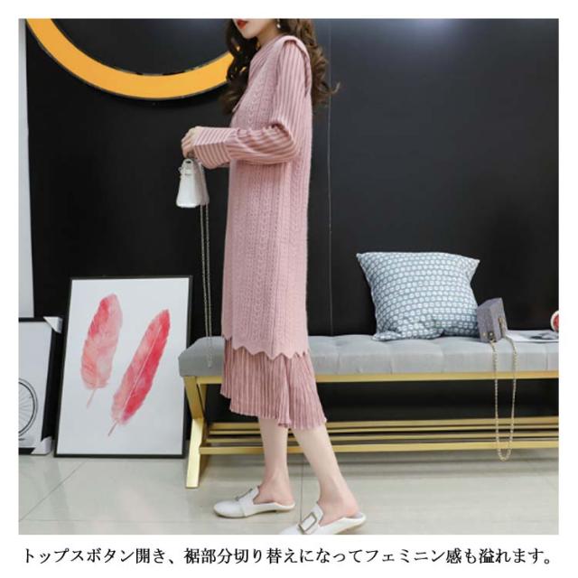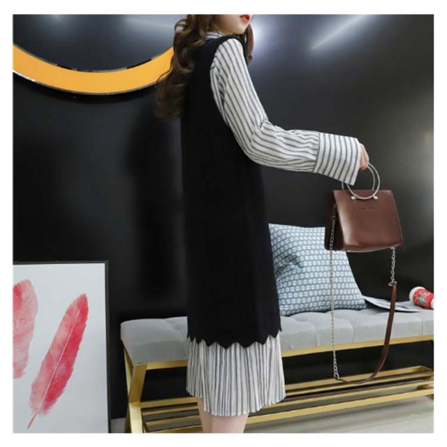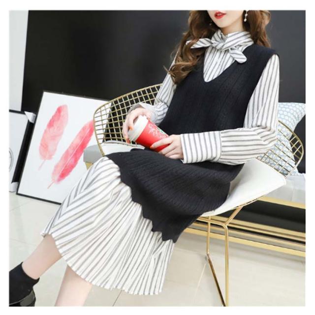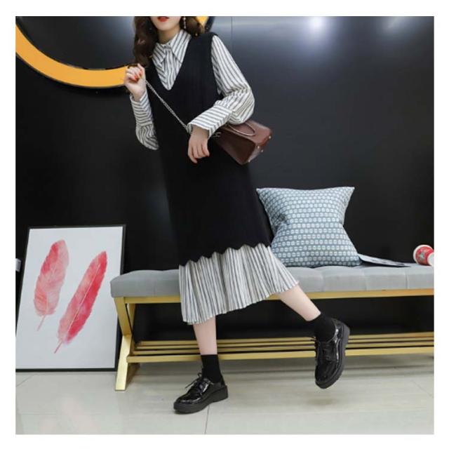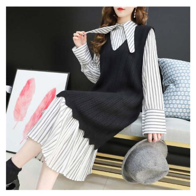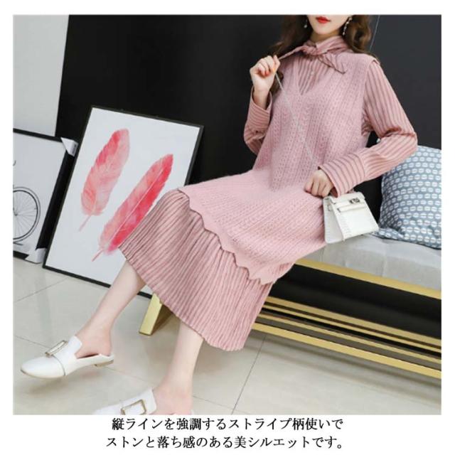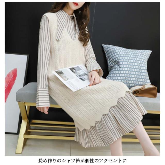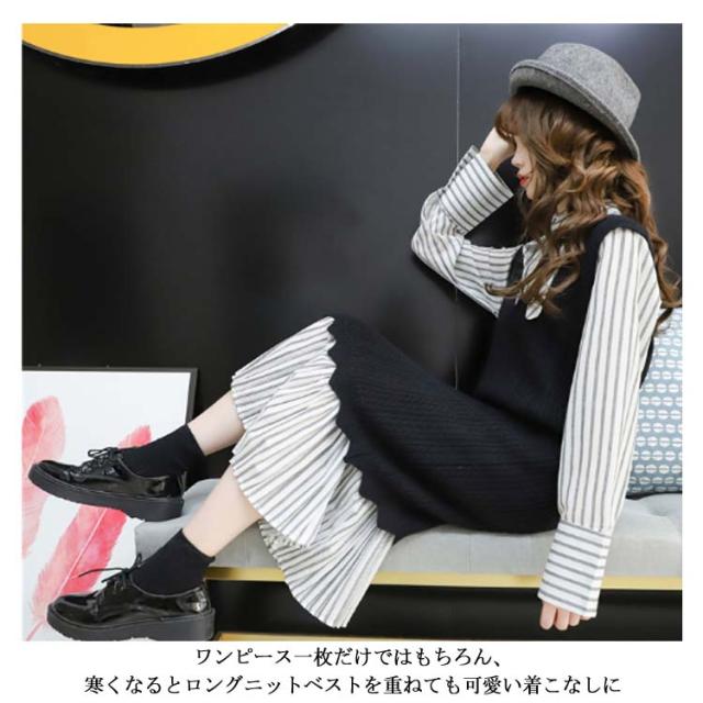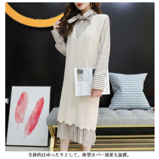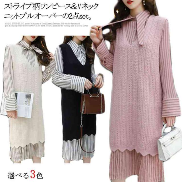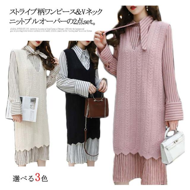 ストライプ柄ロングワンピース&ロングンニットベストのセットアップ!レディース 重ね着 ニット プルオーバー ベスト ワンピース カジュアル キレイめ
