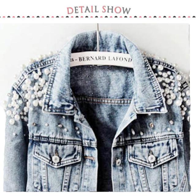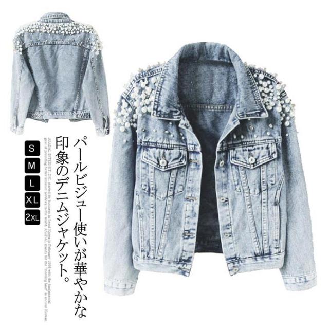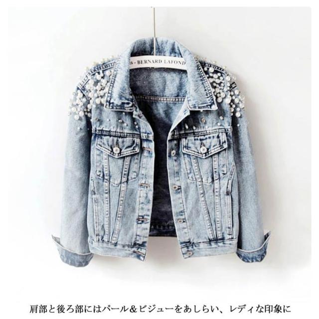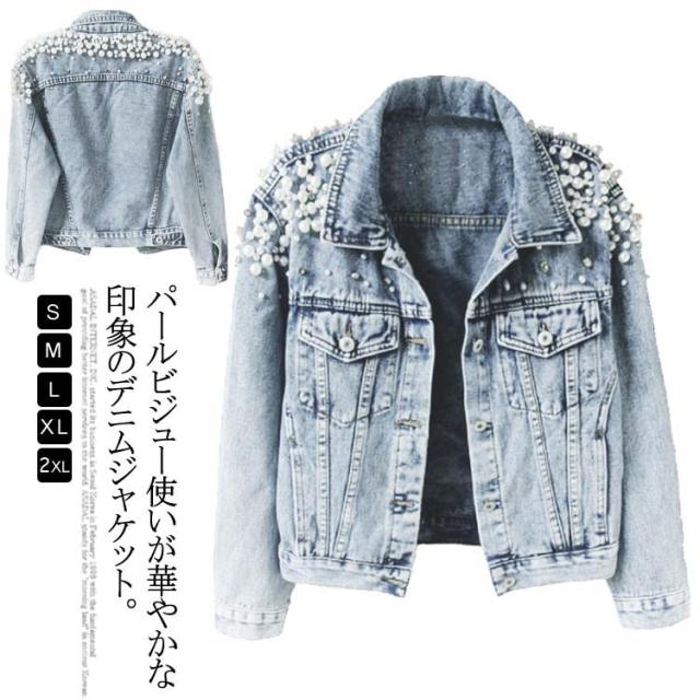 パール&ビジューをあしらい、レディな印象に 長袖 デニムジャケット レディース Gジャン デニム ジャケット
