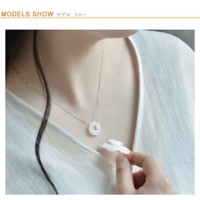 | 身に着けてみると、しっとりとした落ち着きのある雰囲気を醸し出す。 大人の女性に相応しい上質な天然石が肌を美しく見せ、しっくりと馴染みます。 白色が美しい翡翠を使用しており、華やかなゴールドとの組み合わせがとても素敵です。 繊細で丁寧な作りも美しく、気品ある存在感が胸元を綺麗に彩ります。 チェーンは金属アレルギーを起こしにくいステンレスを使用しており、金属アレルギーの方でも安心してご利用いただけます。 | |