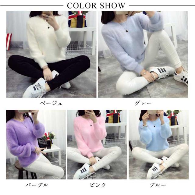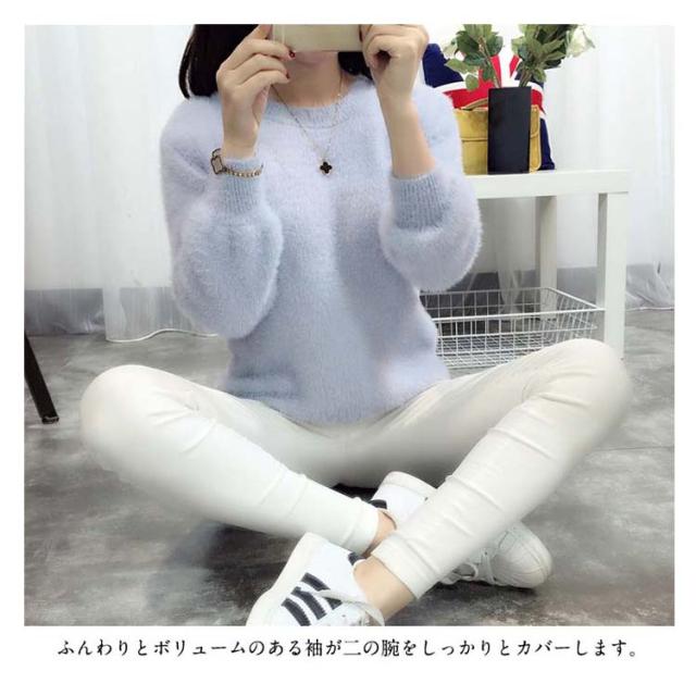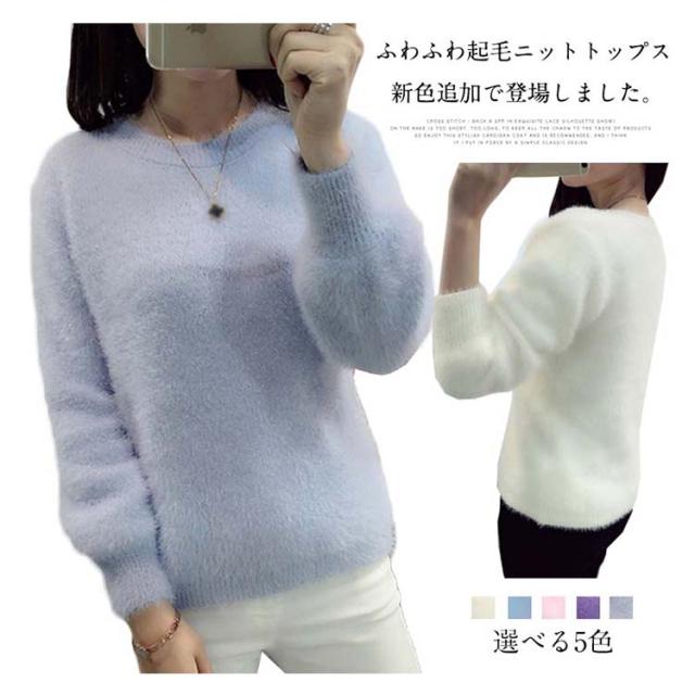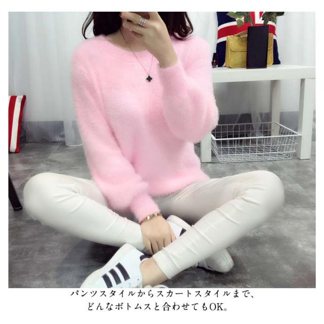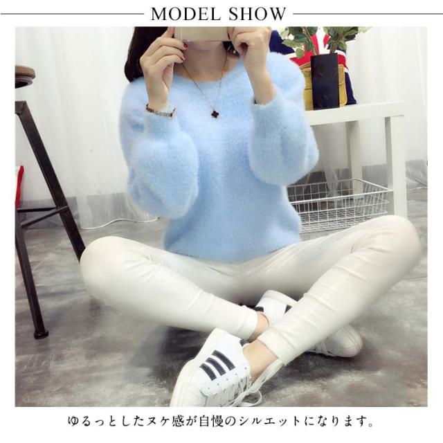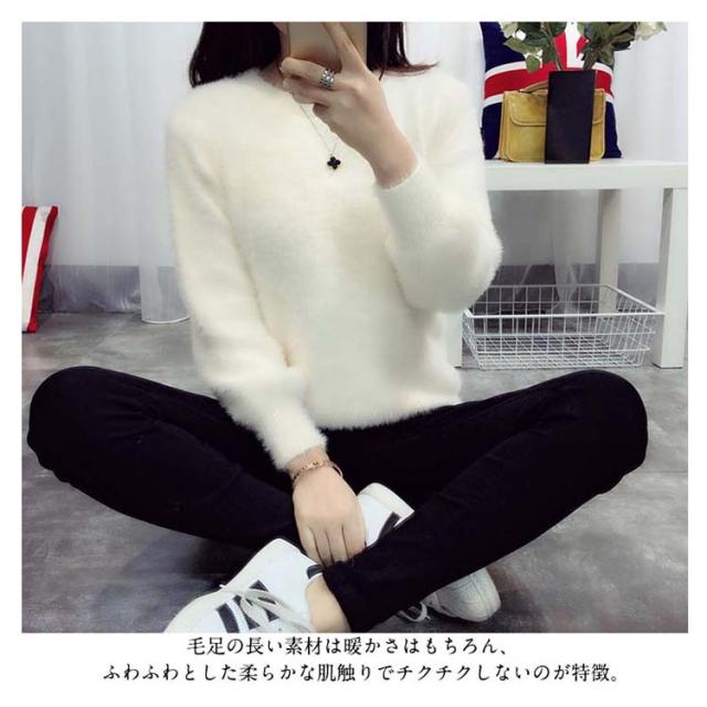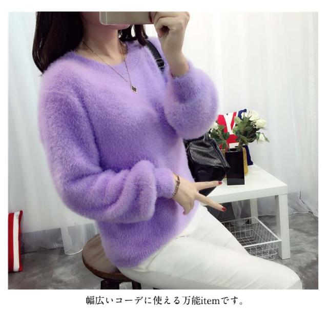 毛足の長い素材で暖かい。レディースニット モヘア ニット ラウンドネック ふんわり 暖かい 秋冬