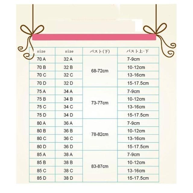 | サイズについての説明 | 70AB(32AB) 75AB(34AB) 80AB(36AB) 85AB(38AB) ※上記サイズは平置き実寸になります。 サイズ表の実寸法は商品によって1-3cm程度の誤差がある場合がございます。 |
