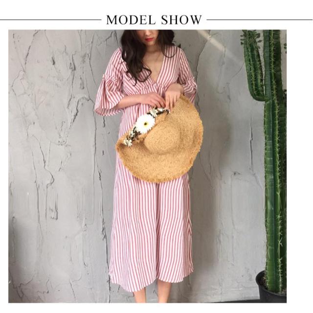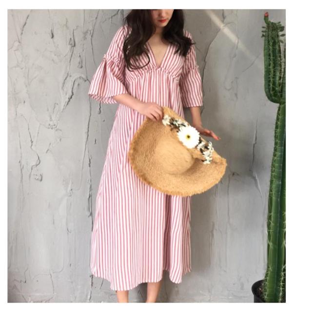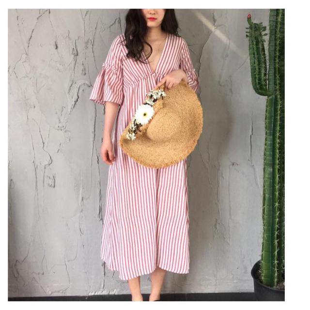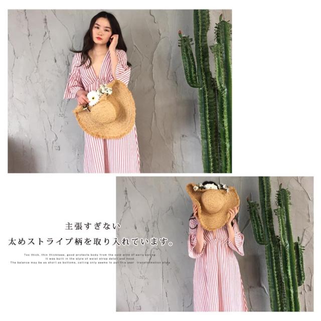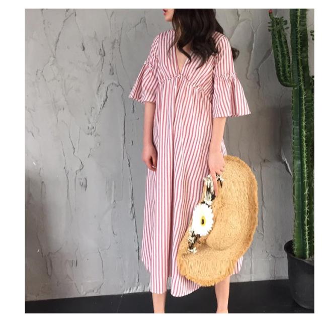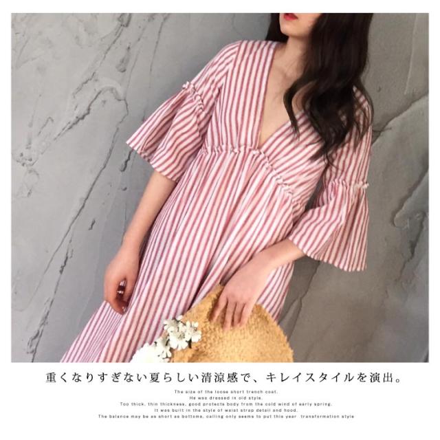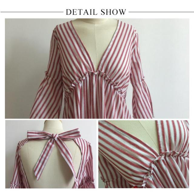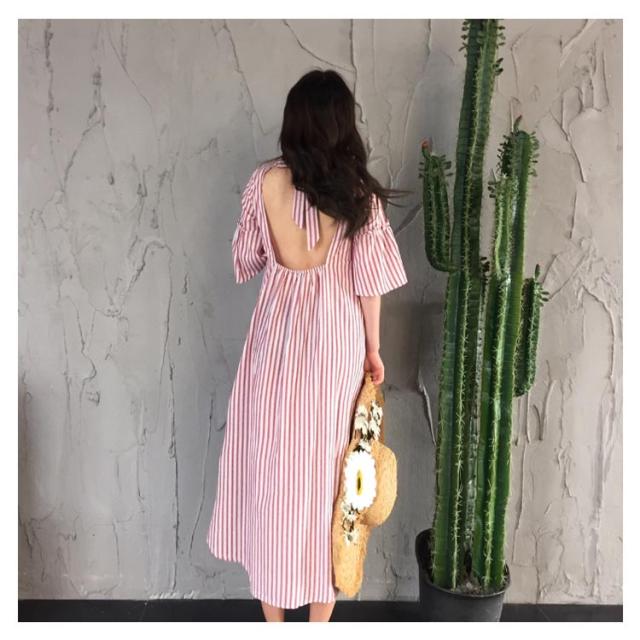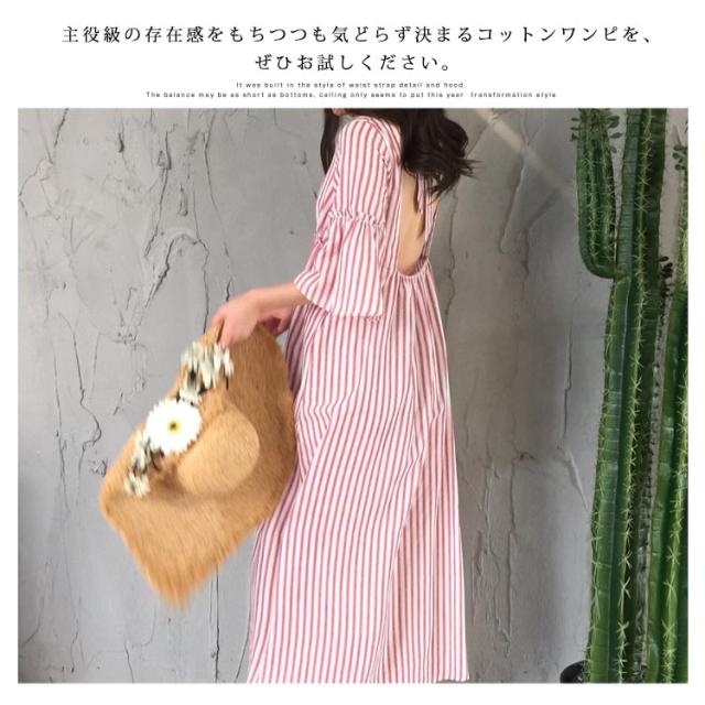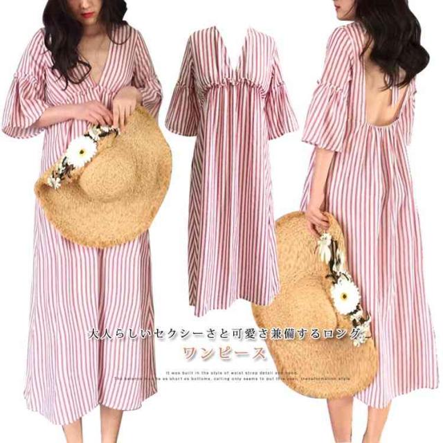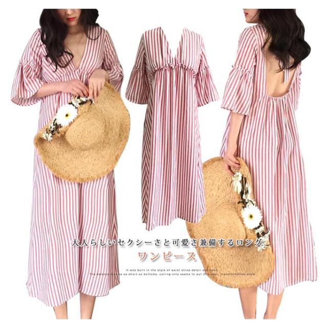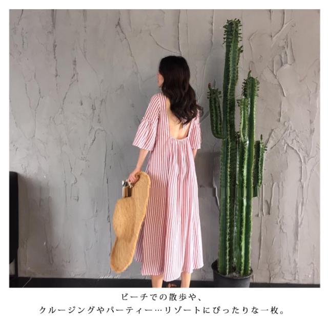 ストライプ柄ロングワンピース バック露出 リゾート 夏ワンピース 5分袖 7分袖 セクシー 肌みせ