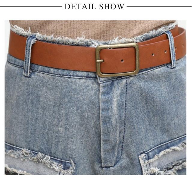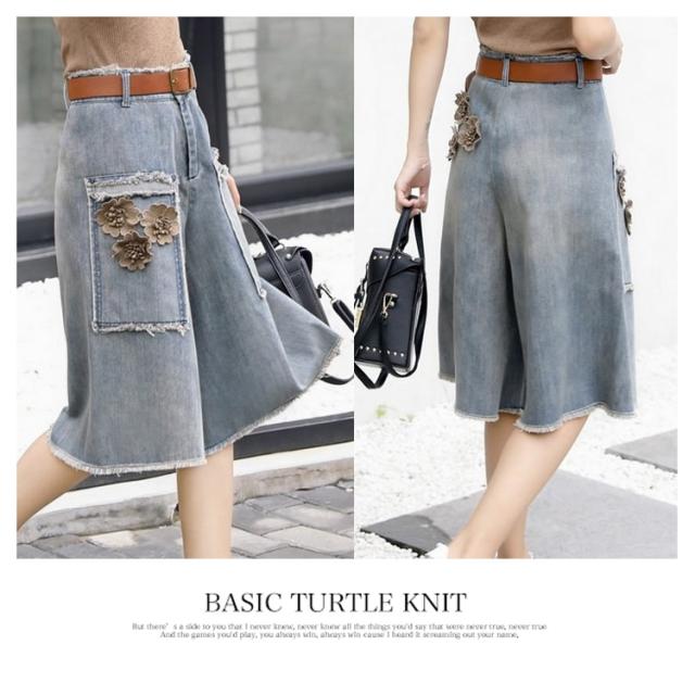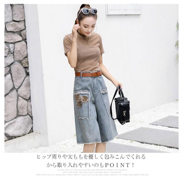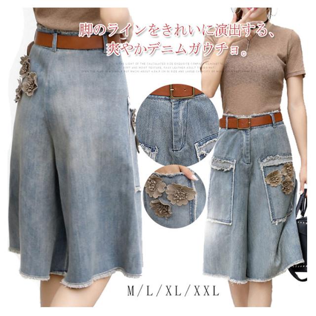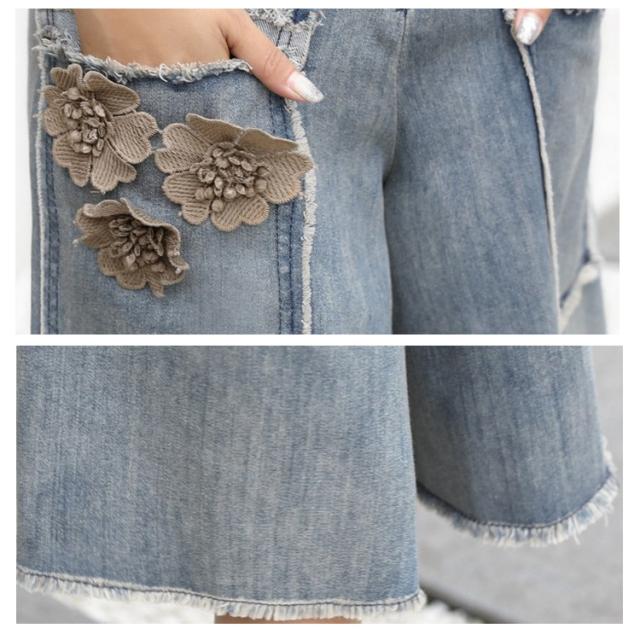 デニム ワイドパンツ 五分丈 パンツ ワイド ガウチョ フラワー飾り 体型カバー ゆったり 大人