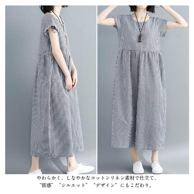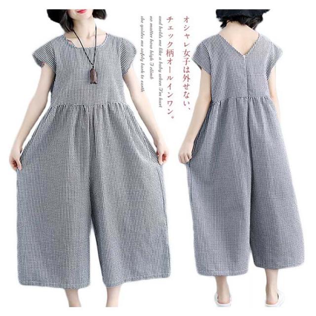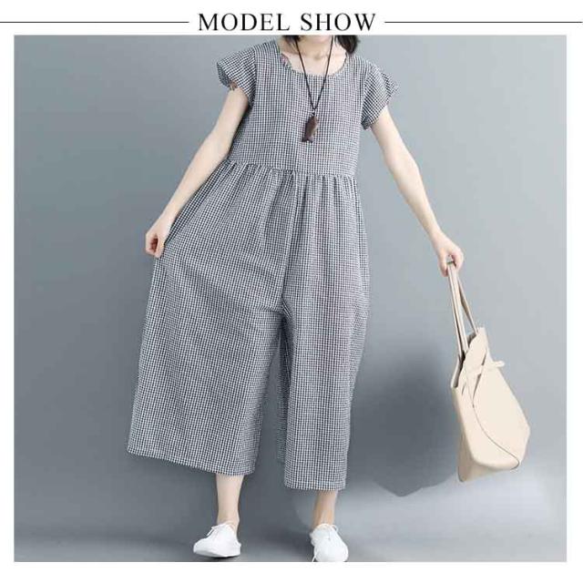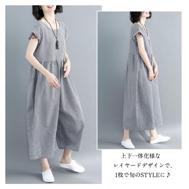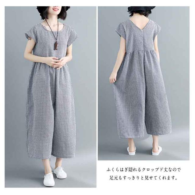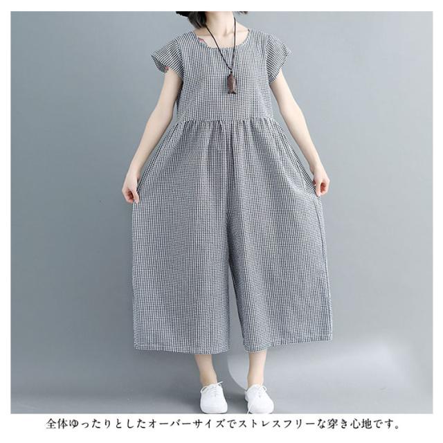 つなぎ 大きサイズ オールインワン ガウチョパンツ 七分丈 綿麻 ゆったり かわいい