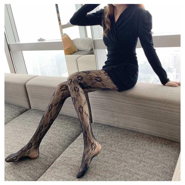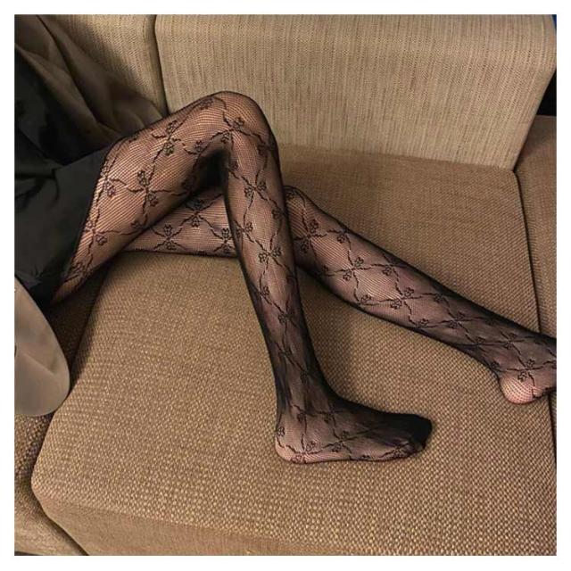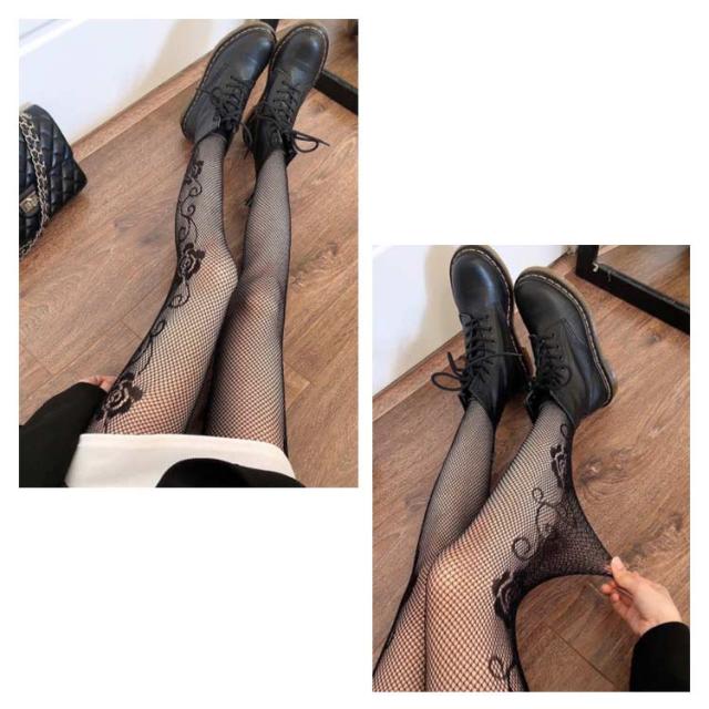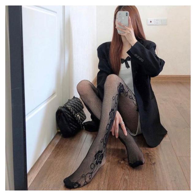 【送料無料】アンティークローズ柄網タイツ 小花柄ストッキング ストキング 網ストッキング ローズ柄ストッキング 黒タイツ 柄タイツ オールスルー