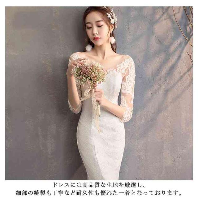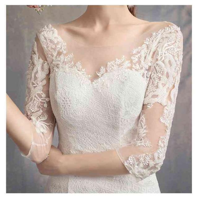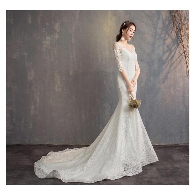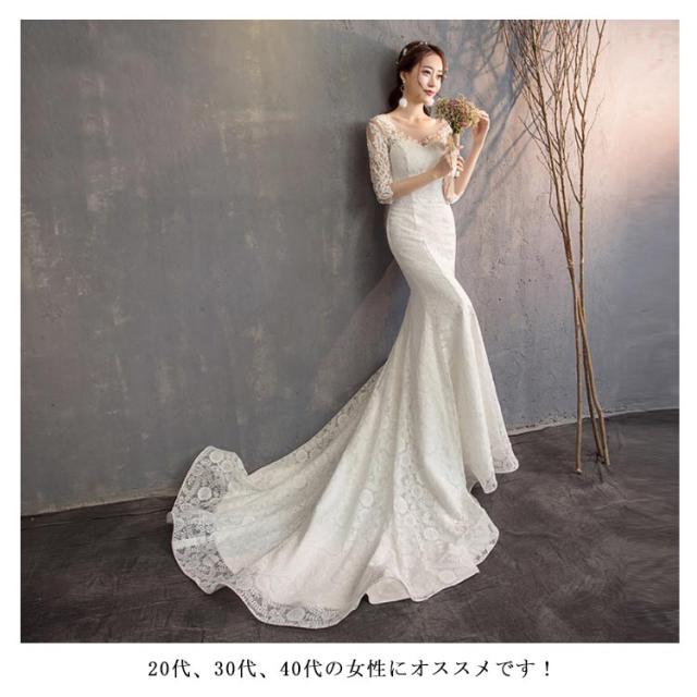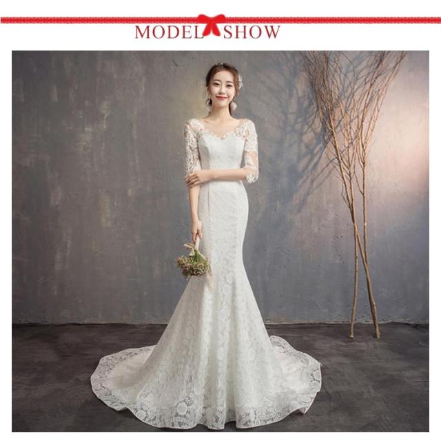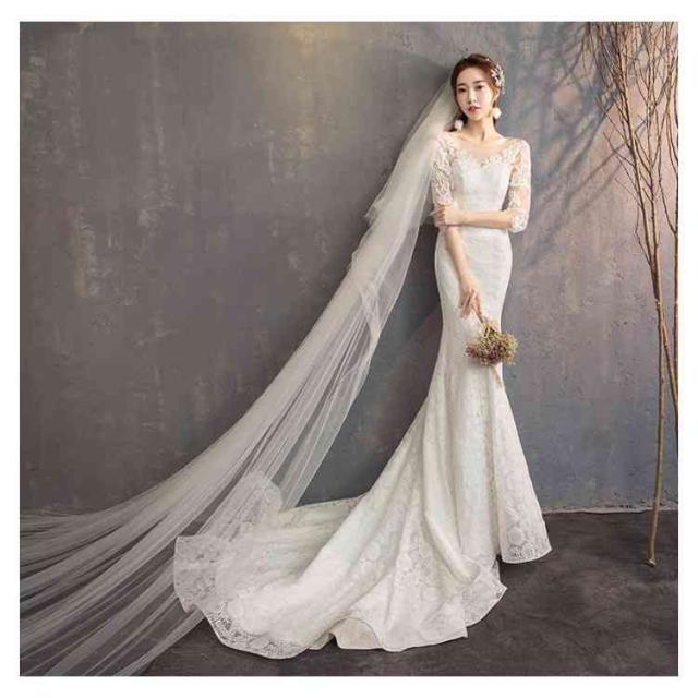 ウェディングドレス マーメイドライン トレーン付き ドレス ウェディング Vネック 長袖 七分袖 ウェディングドレス ウエディングドレス 編み上げタイプ フィッシュテール トレーンドレス 結婚式 ワンピース 海外 挙式 ホワイト 白