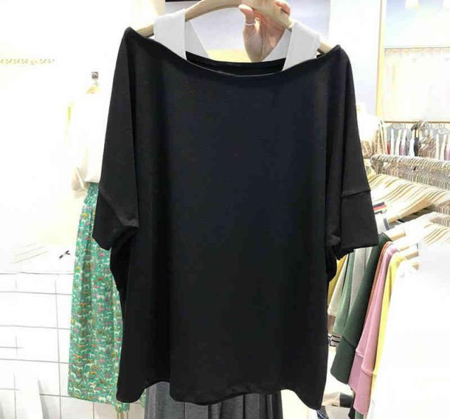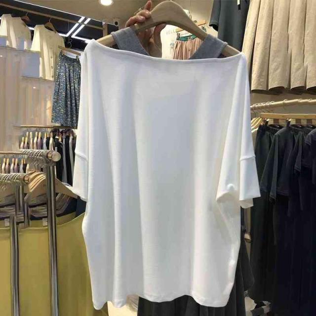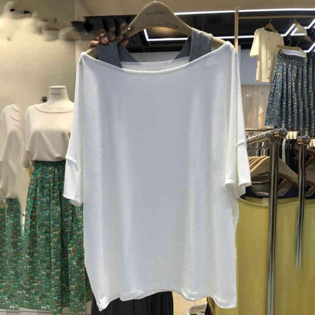 ドロップショルダー 半袖 カットソー レディース 女性用 フェイクレイヤード トップス 重ね着風 Tシャツ オフショルダー 肩出し バイカラー