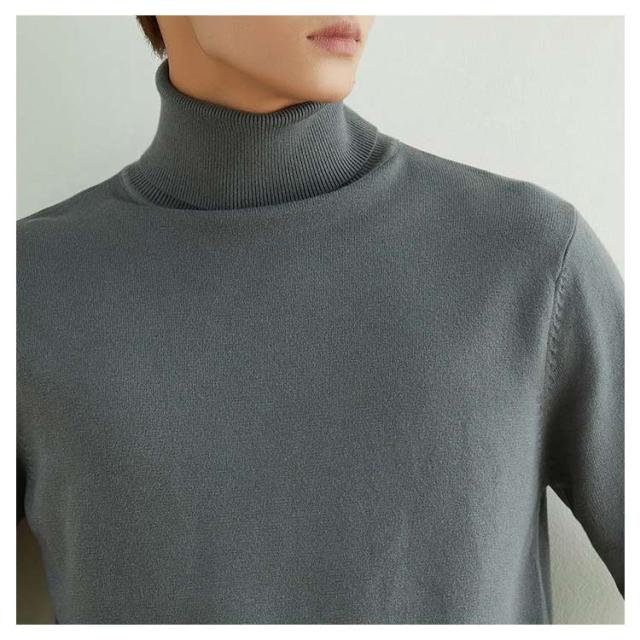 | チクチクしない優しい肌触りで、ストレッチが効いておりとても動きやすく、カシミアの様な柔らかいニットが寒くて乾燥した肌を優しく包んでくれます。 タイト過ぎない絶妙に計算されたサイズ感により野暮ったく見えず、ほど良いゆるさのシルエットを形成。 伸縮性があるので、締め付け感なくストレスフリーな着心地。 首元のタートルネックがアクセントとなり、こなれ感漂う大人の雰囲気を演出。 肉厚過ぎない生地感なので、幅広いレイヤードを楽しめると共に一枚でもサマになり秋口から春先までロングシーズン着用できるとこもも嬉しいポイント◎ | |