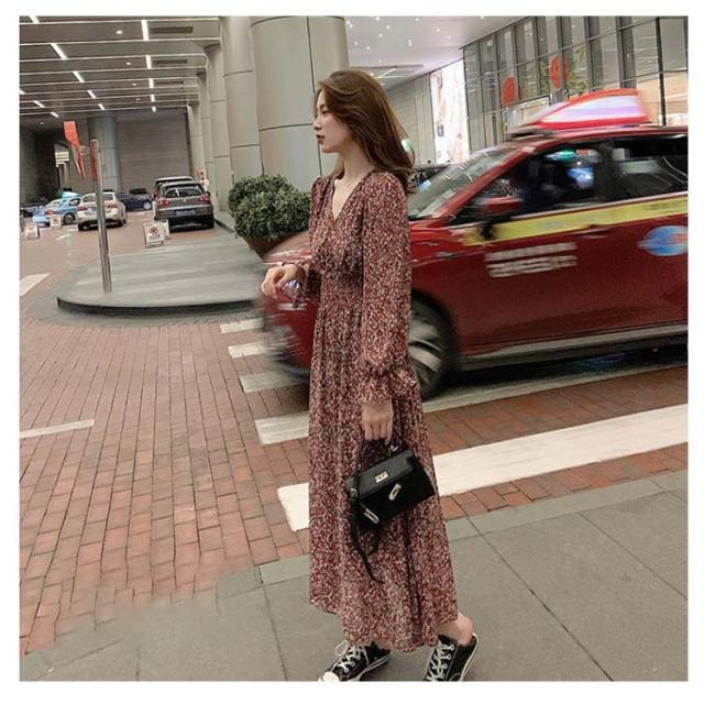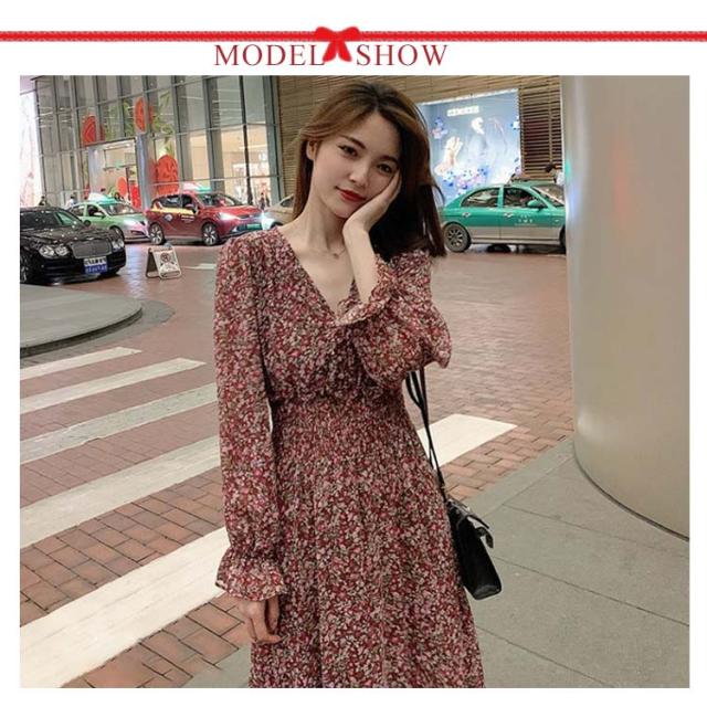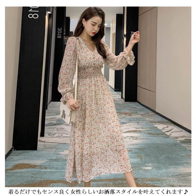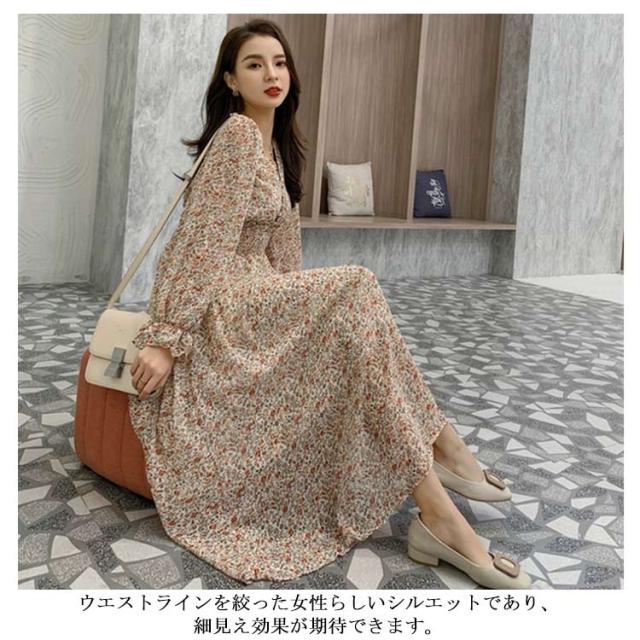 送料無料 ワンピース レディース 花柄ワンピース ロングワンピース 長袖 マキシワンピース 総柄 バルーンスリーブ フレアワンピース ウエストゴム ロング丈 Vネック Aライン 着痩せ かわいい 体型カバー 清楚